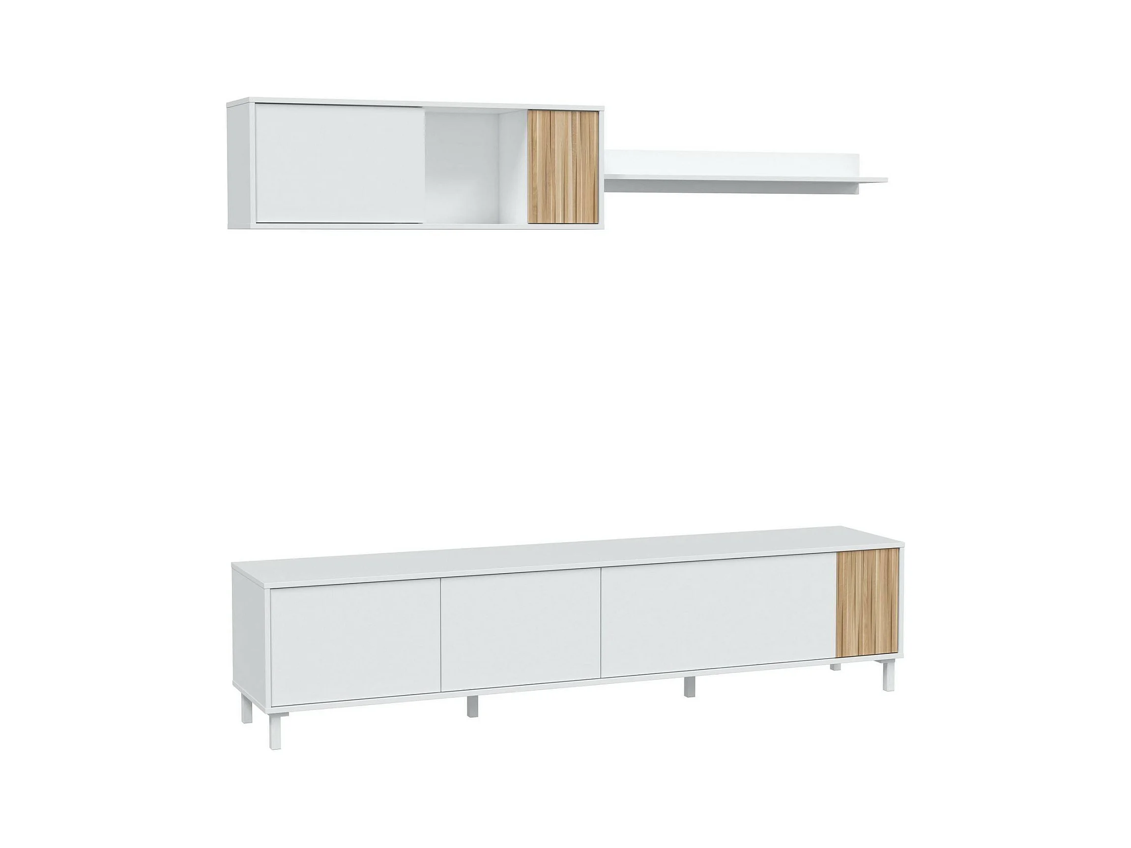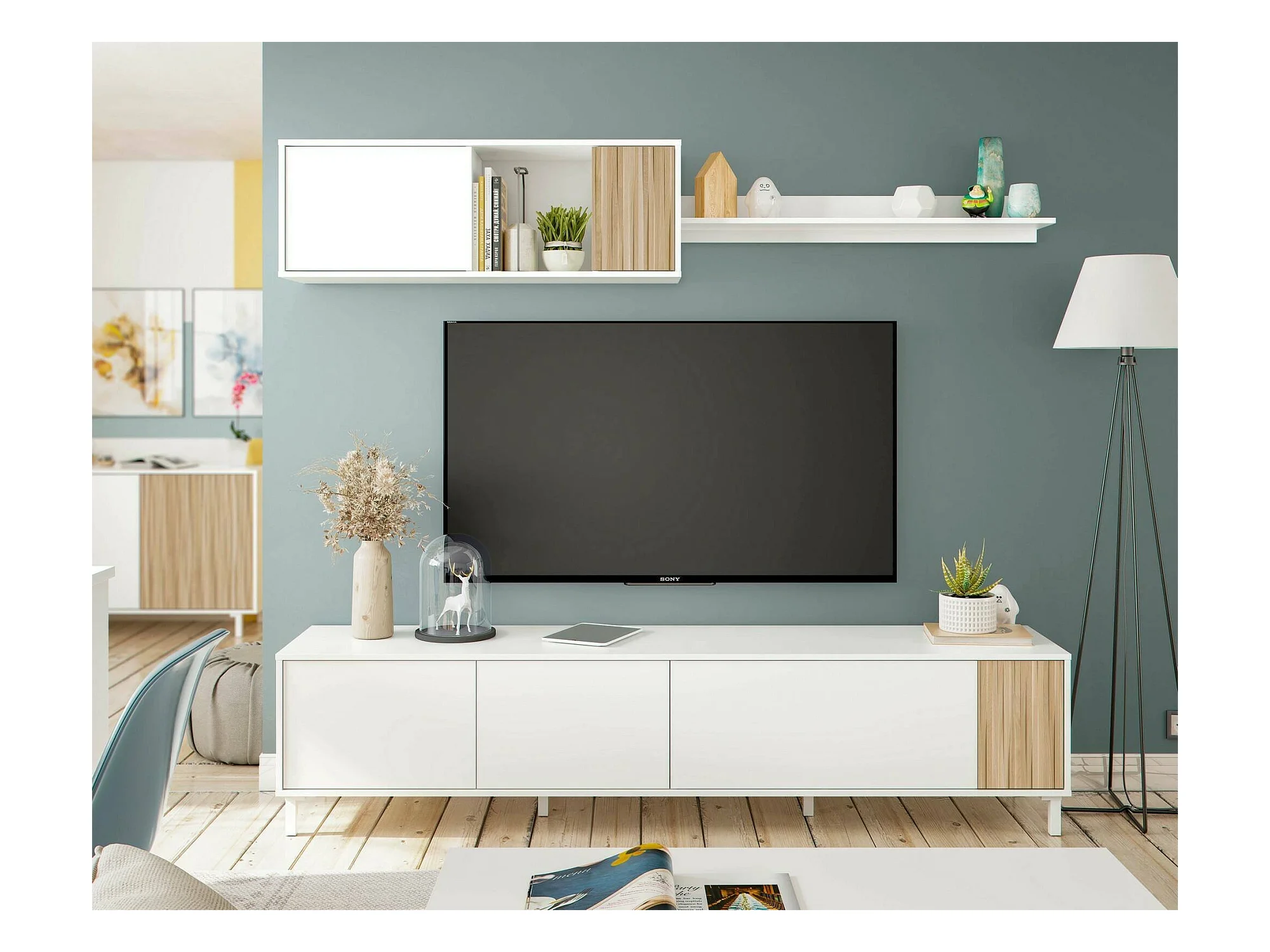 Unité murale Woonsocket, Armoire de salon avec portes, Armoire suspendue avec étagère, Buffet polyvalent, 200x40h47 cm, Blanc et Chêne