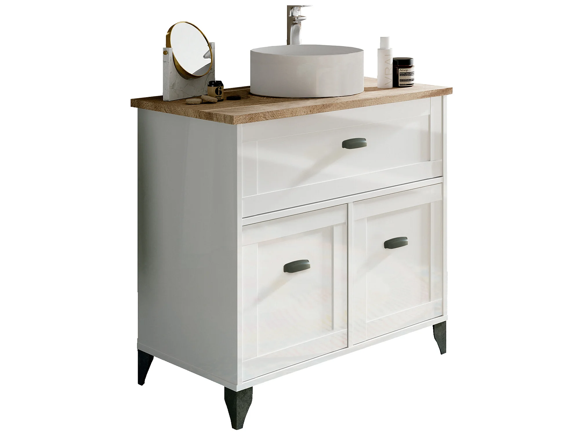Meuble Vasque 2 portes + 1 tiroir coloris blanc Mat/Cambrian - Hauteur 95 x Longueur 82 x Profondeur 47 cm