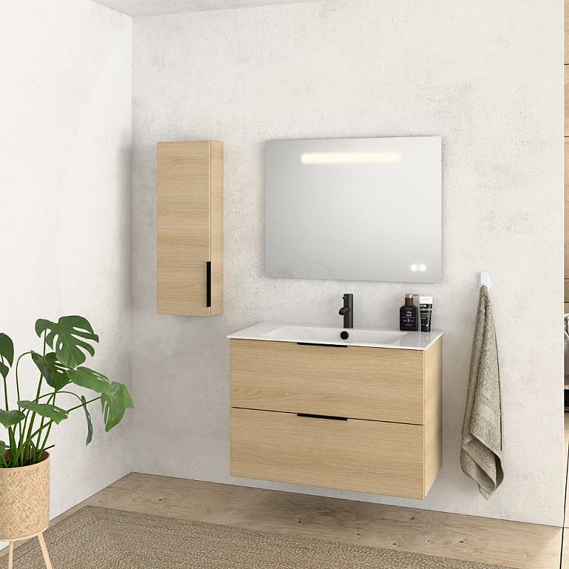 Meuble vasque 60 cm BURGBAD Olena chêne clair + miroir + colonne de salle de bain