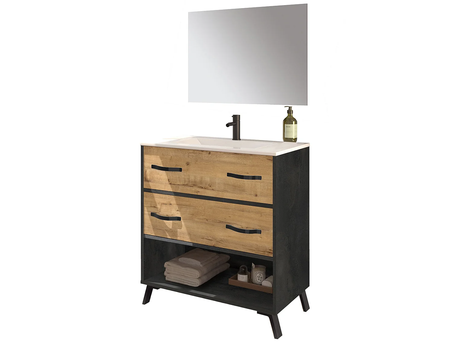 Meuble Vasque avec miroir coloris Marbre / chêne doré - Hauteur 90 x Longueur 81 x Profondeur 47 cm