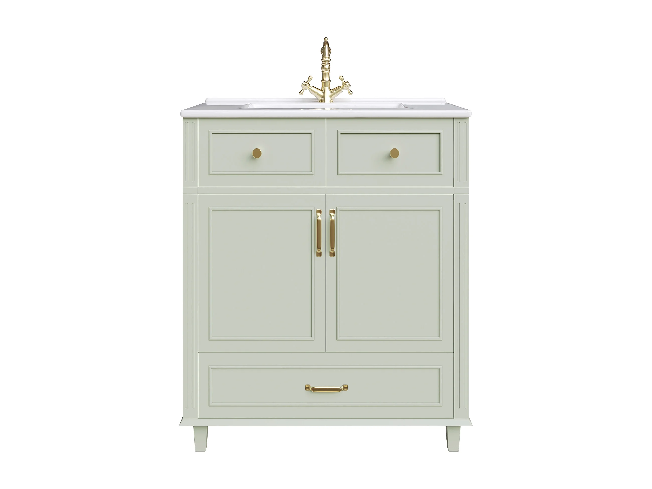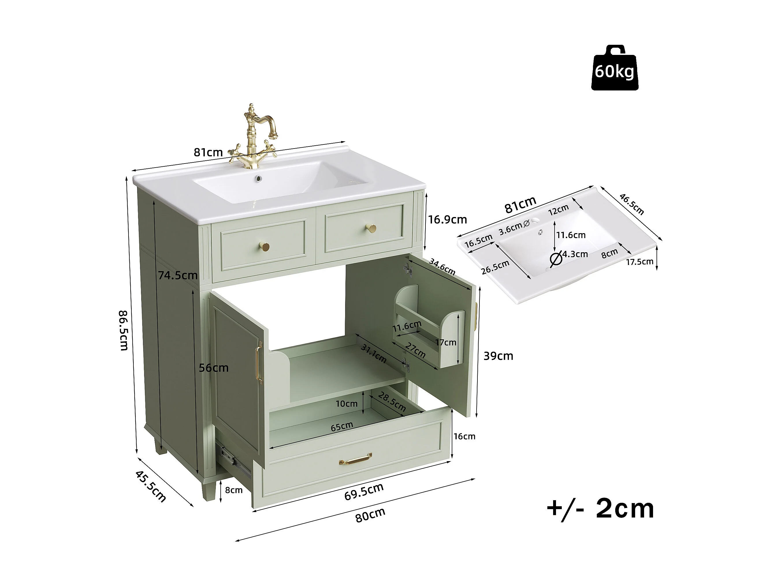 Meuble vasque en céramique de salle de bain - 81 x 45.5 x 86.5 cm - avec tiroir + portes - MDF - vert