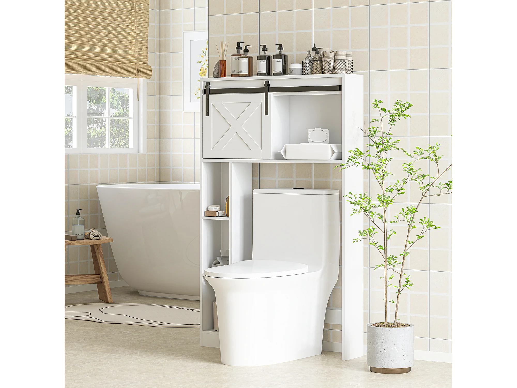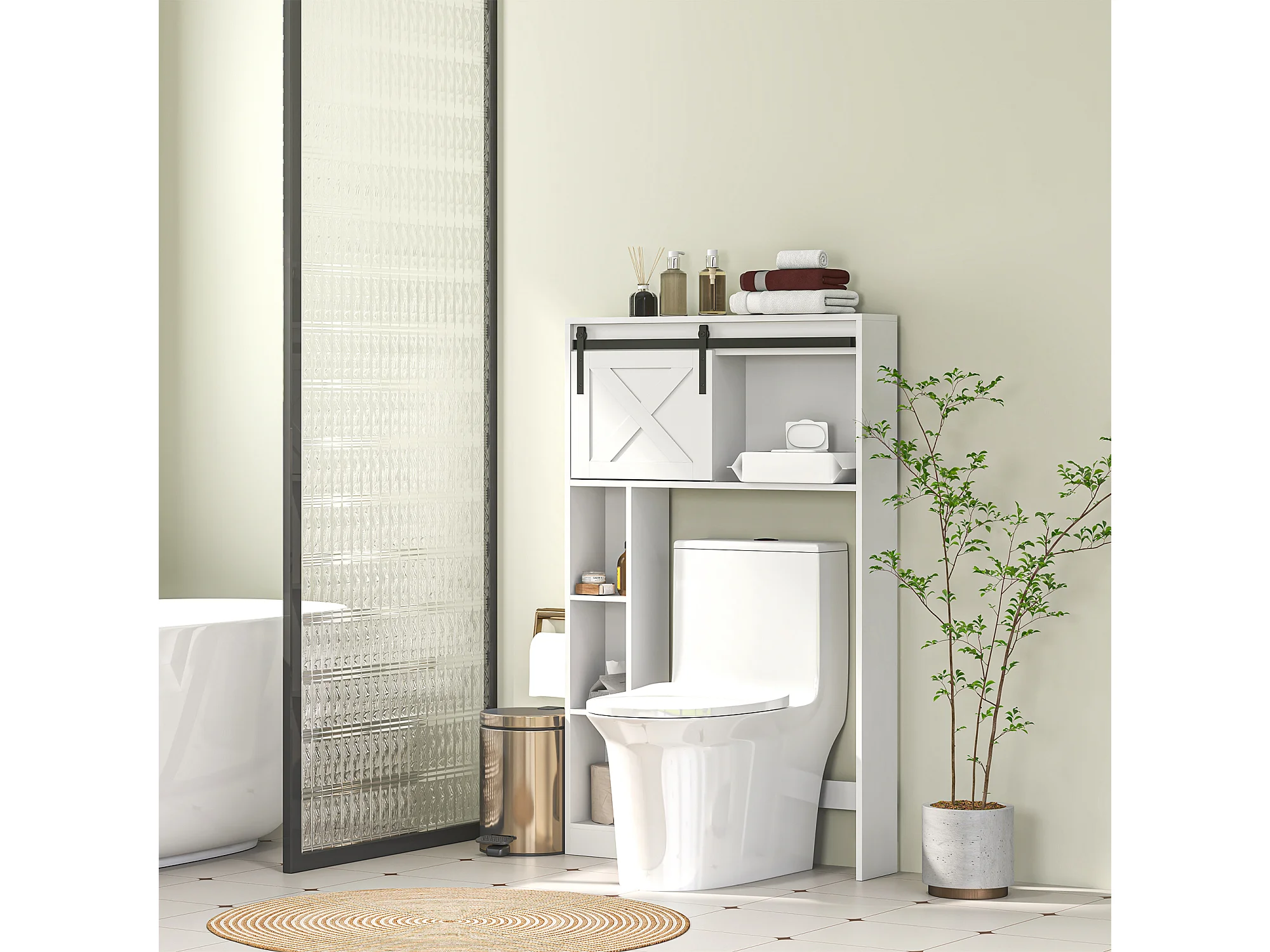Meuble WC dessus de toilette meuble toilettes - porte coulissante, 6 compartiments - blanc