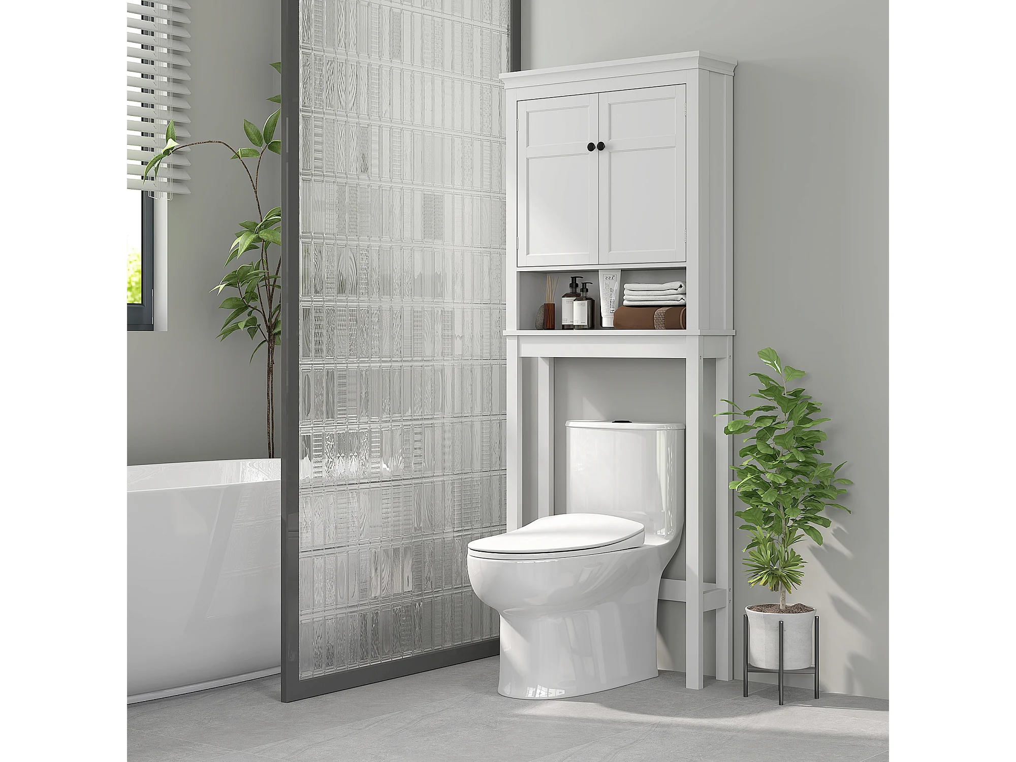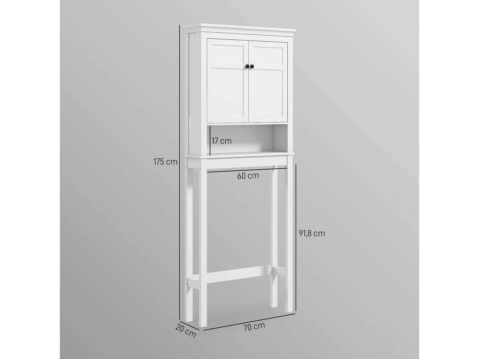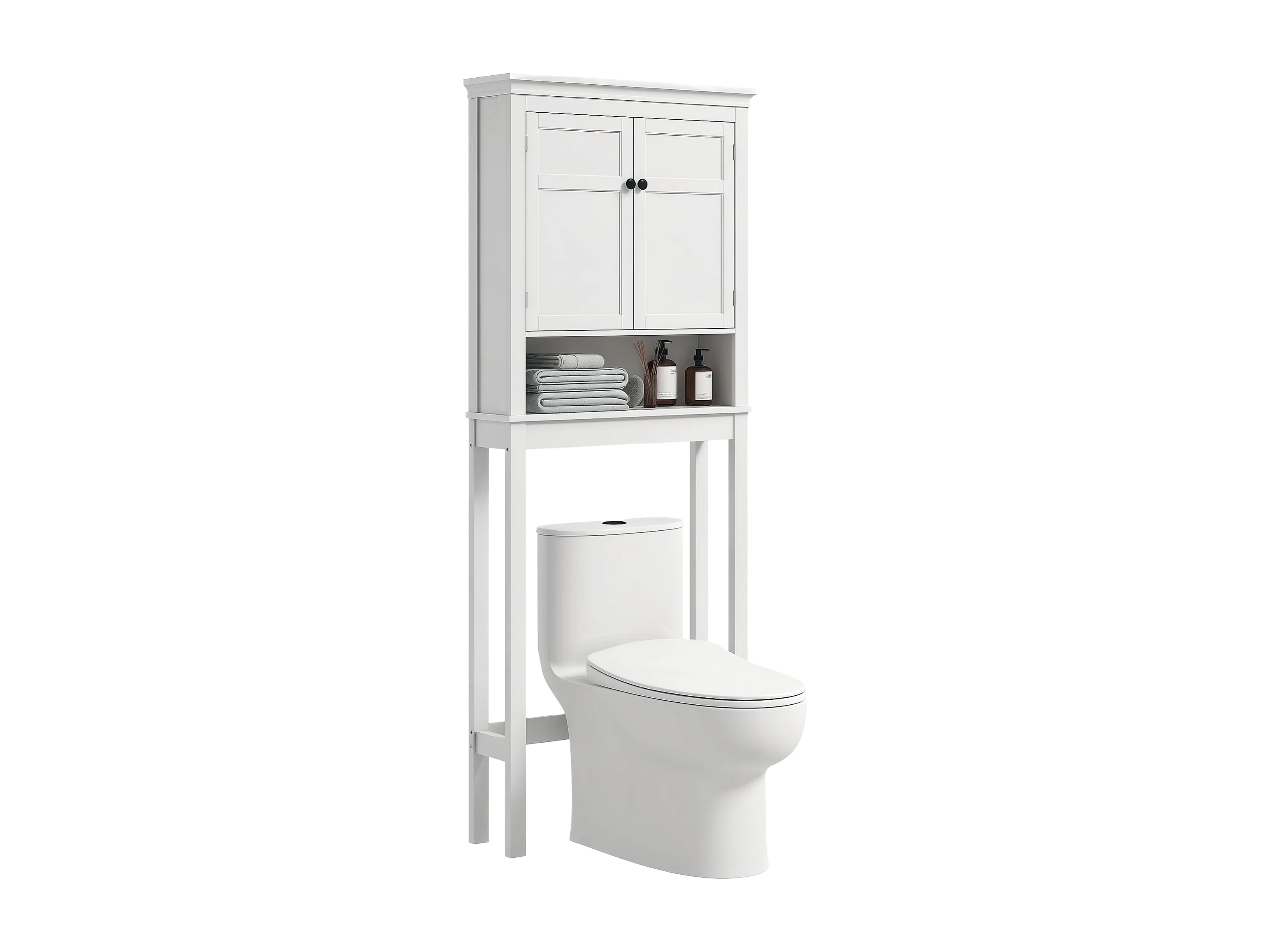 Meuble WC dessus de toilette - 2 portes, étagère, niche - poignées métal MDF blanc