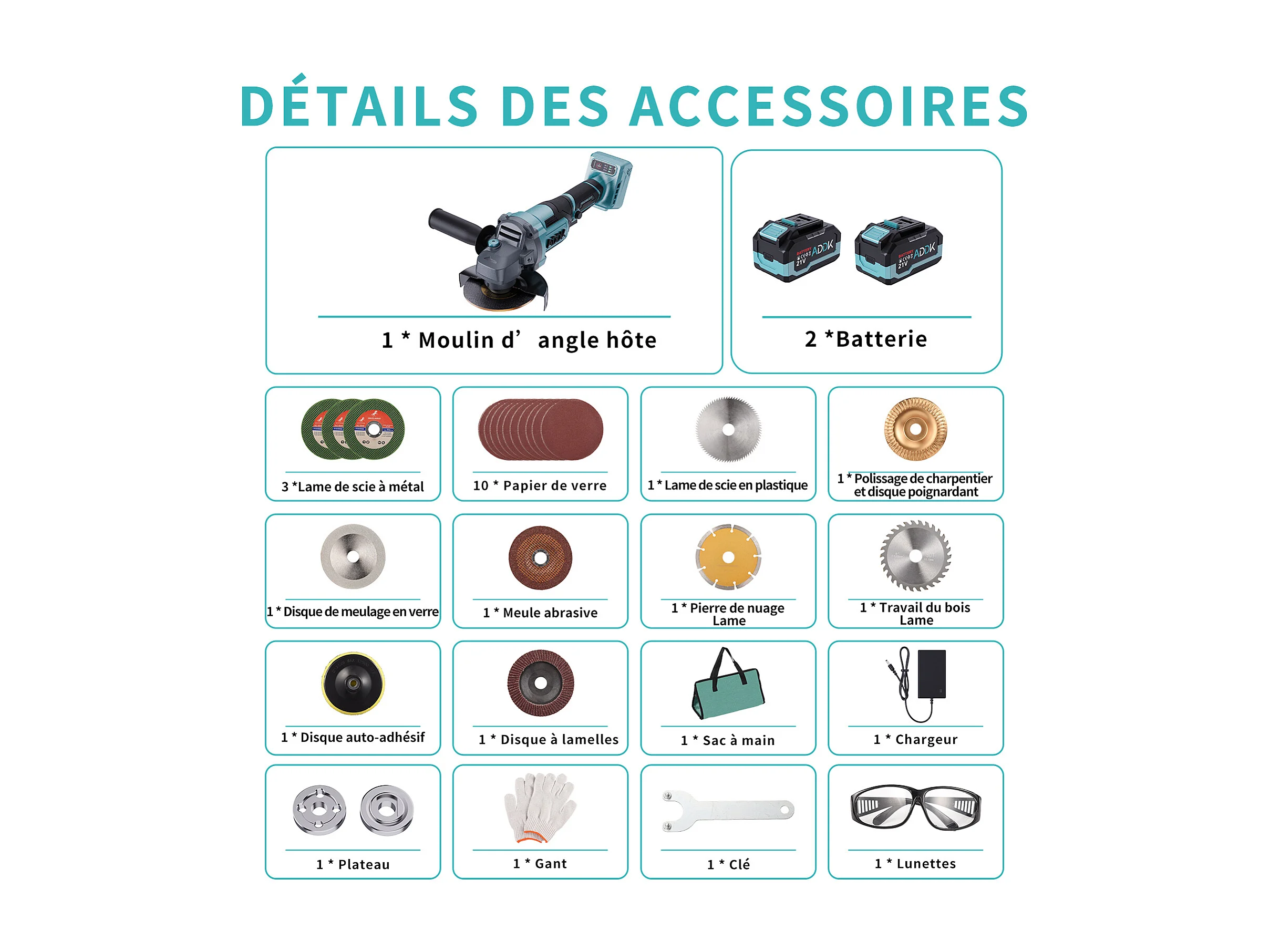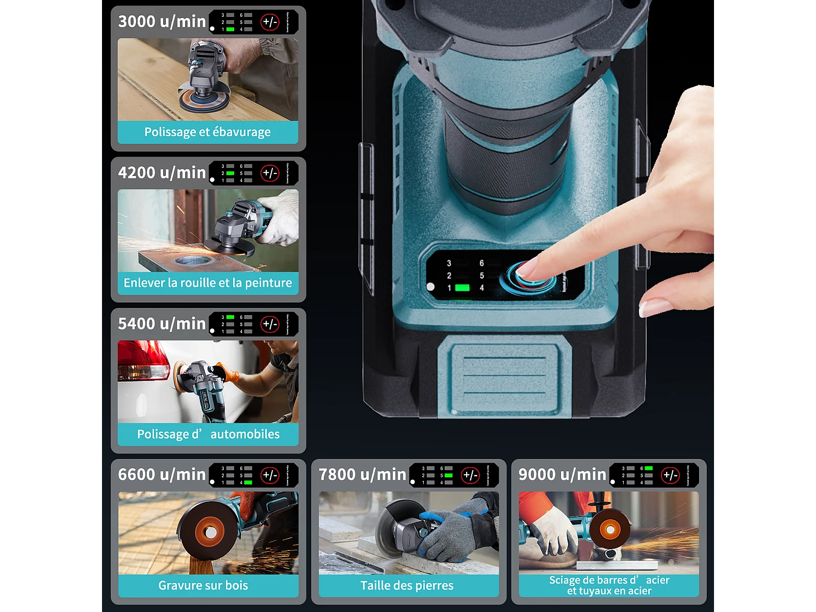 Meuleuse d'angle sans fil 125mm -2xbatterie 21 V 4,0 Ah - moteur sans balais 9 000 tr/min - 6 niveaux réglables