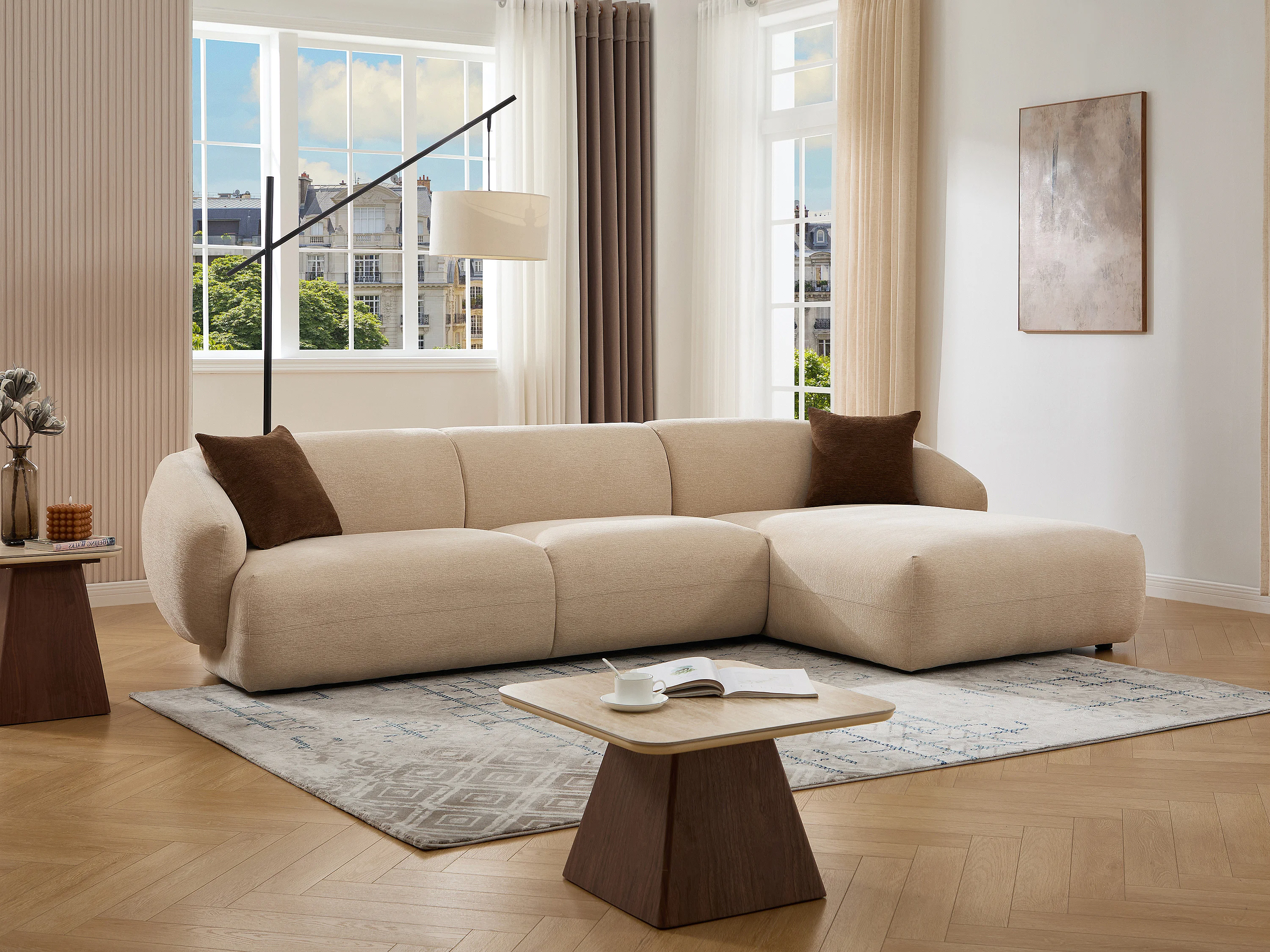 Canapé d'angle droit en tissu texturé beige MIBASTO