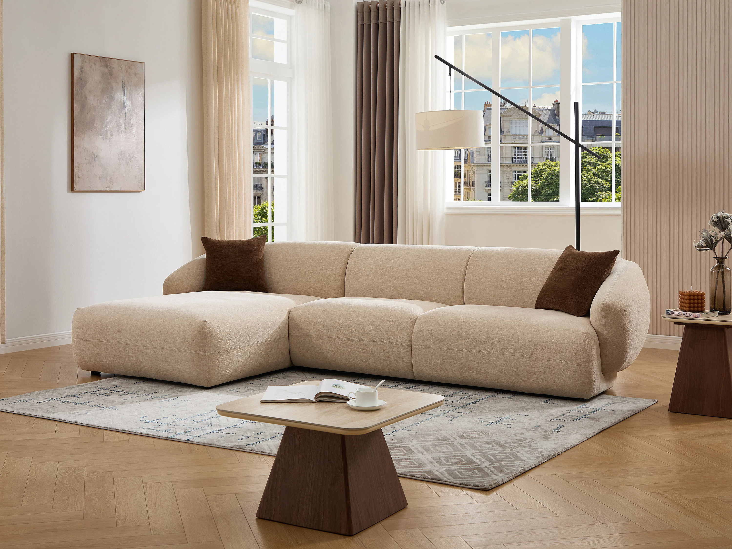 Canapé d'angle gauche en tissu texturé beige MIBASTO