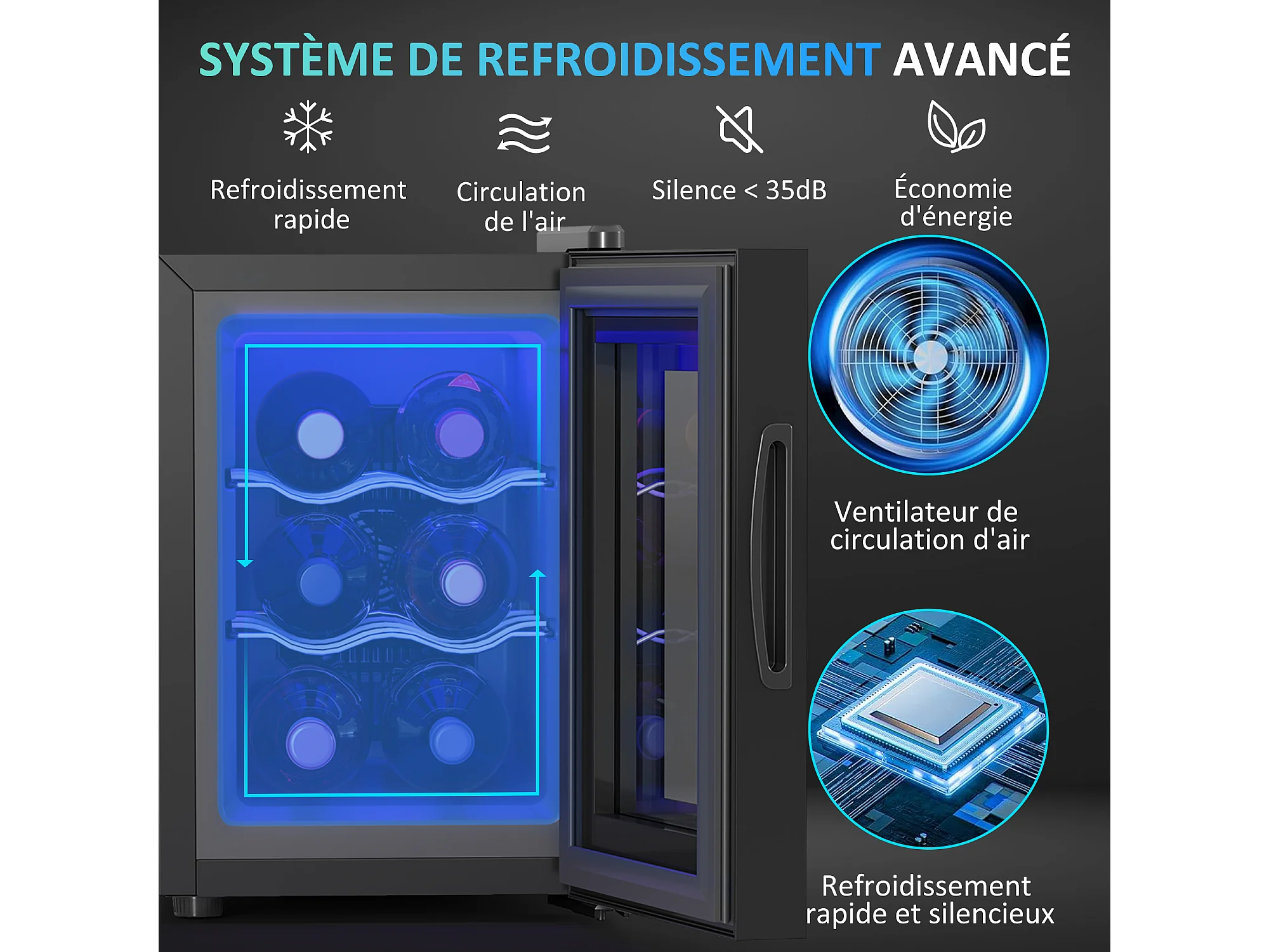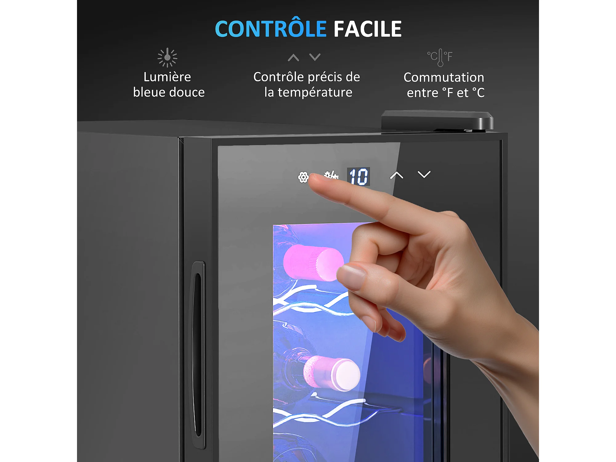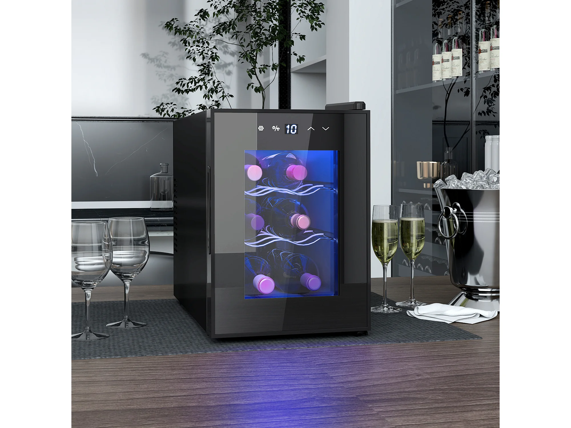 Mini cave à vin 6 bouteilles 17L T.5-18°C éclairage LED écran tactile numérique porte verre anti-UV noir