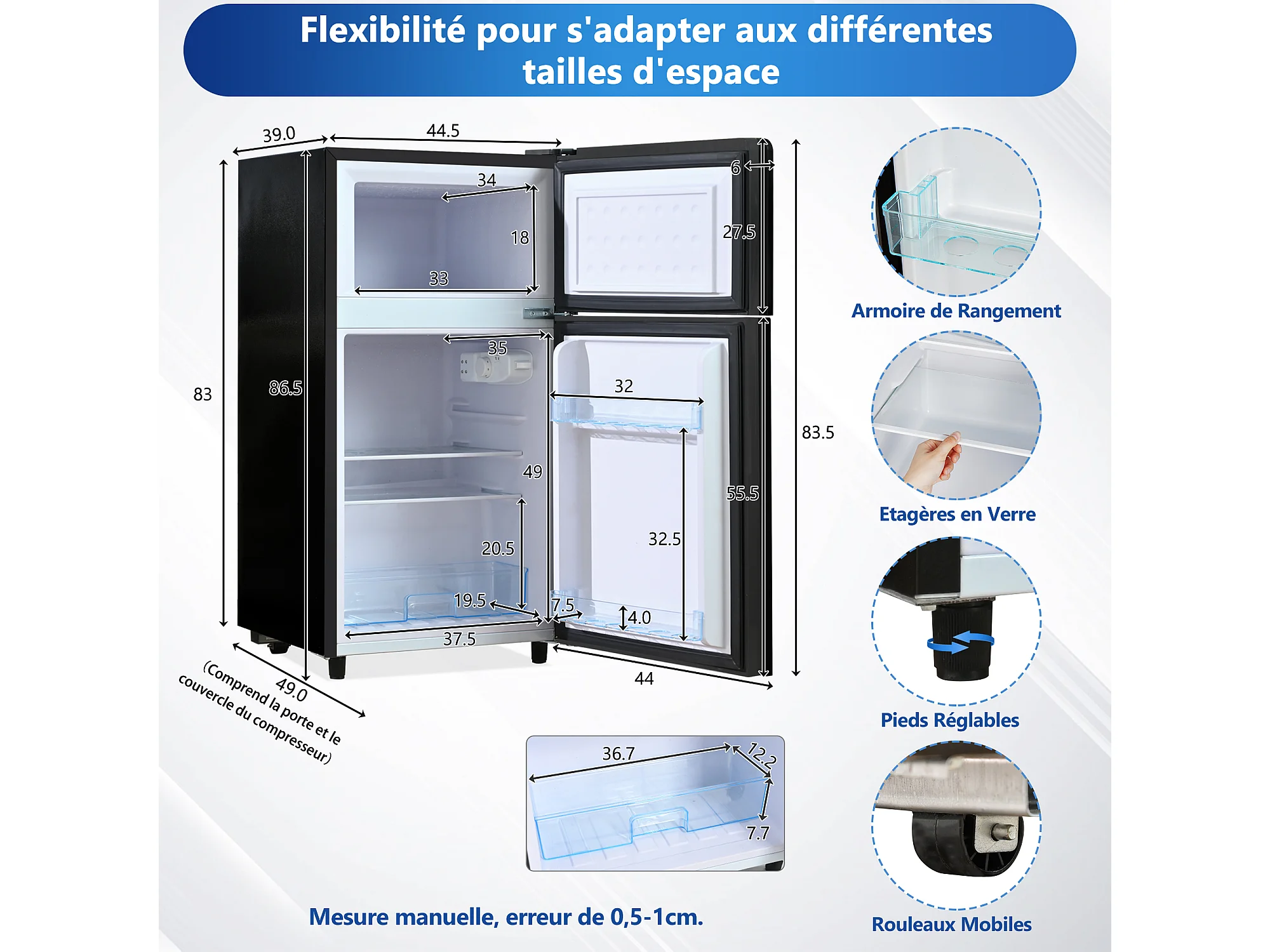 Mini-réfrigérateur 72 L avec porte en verre noir - Thermostat réglable sur 7 niveaux et LED