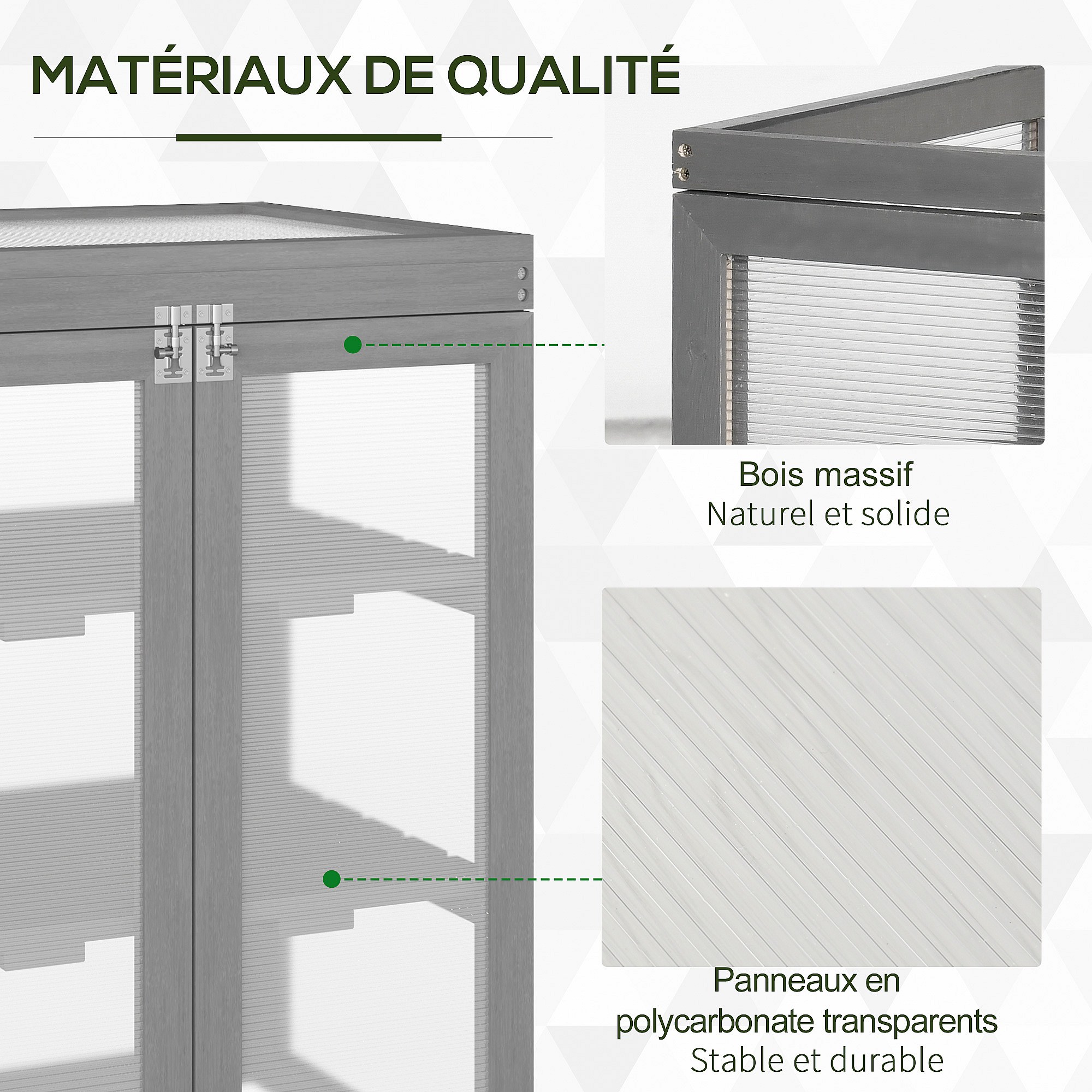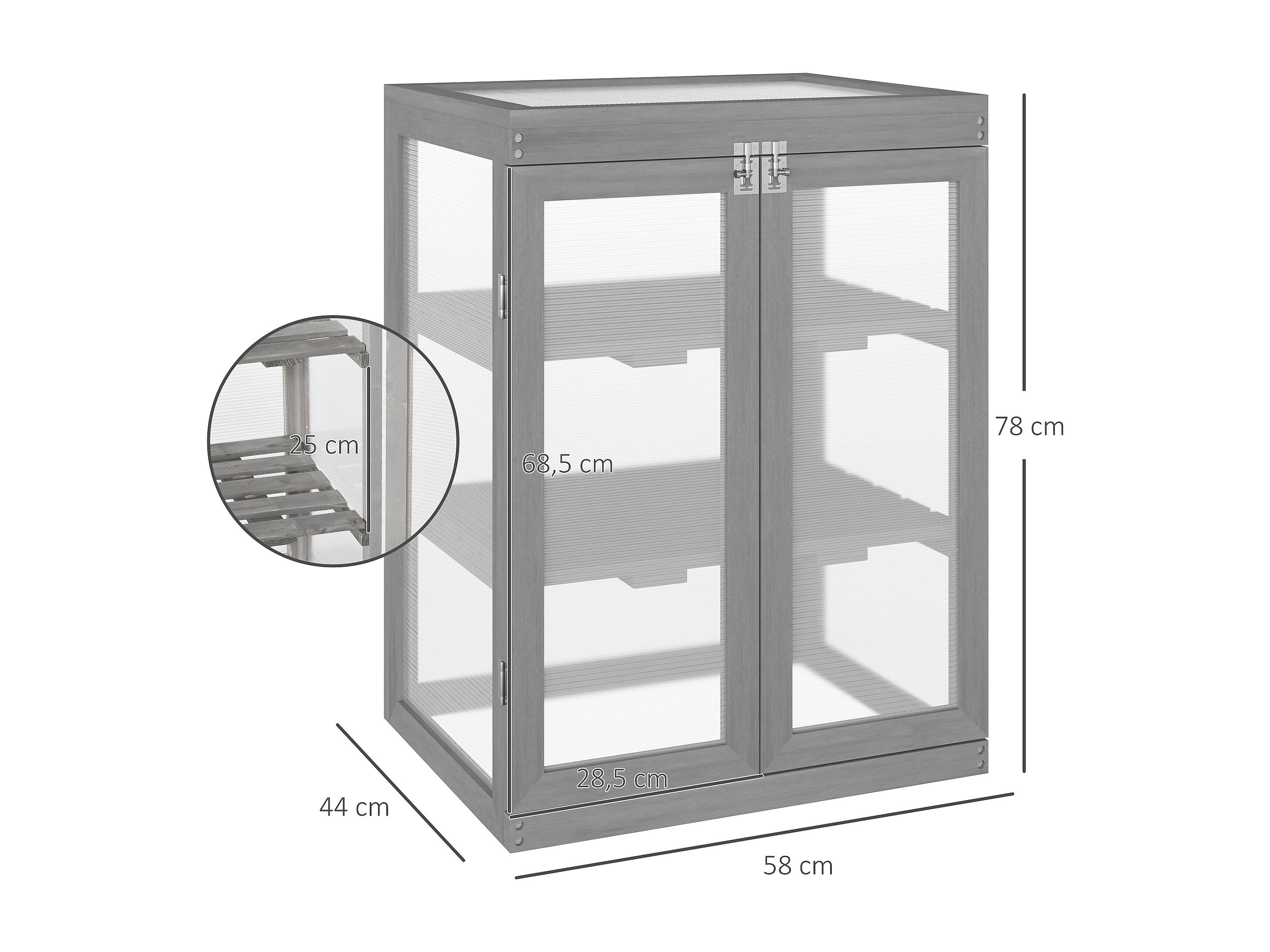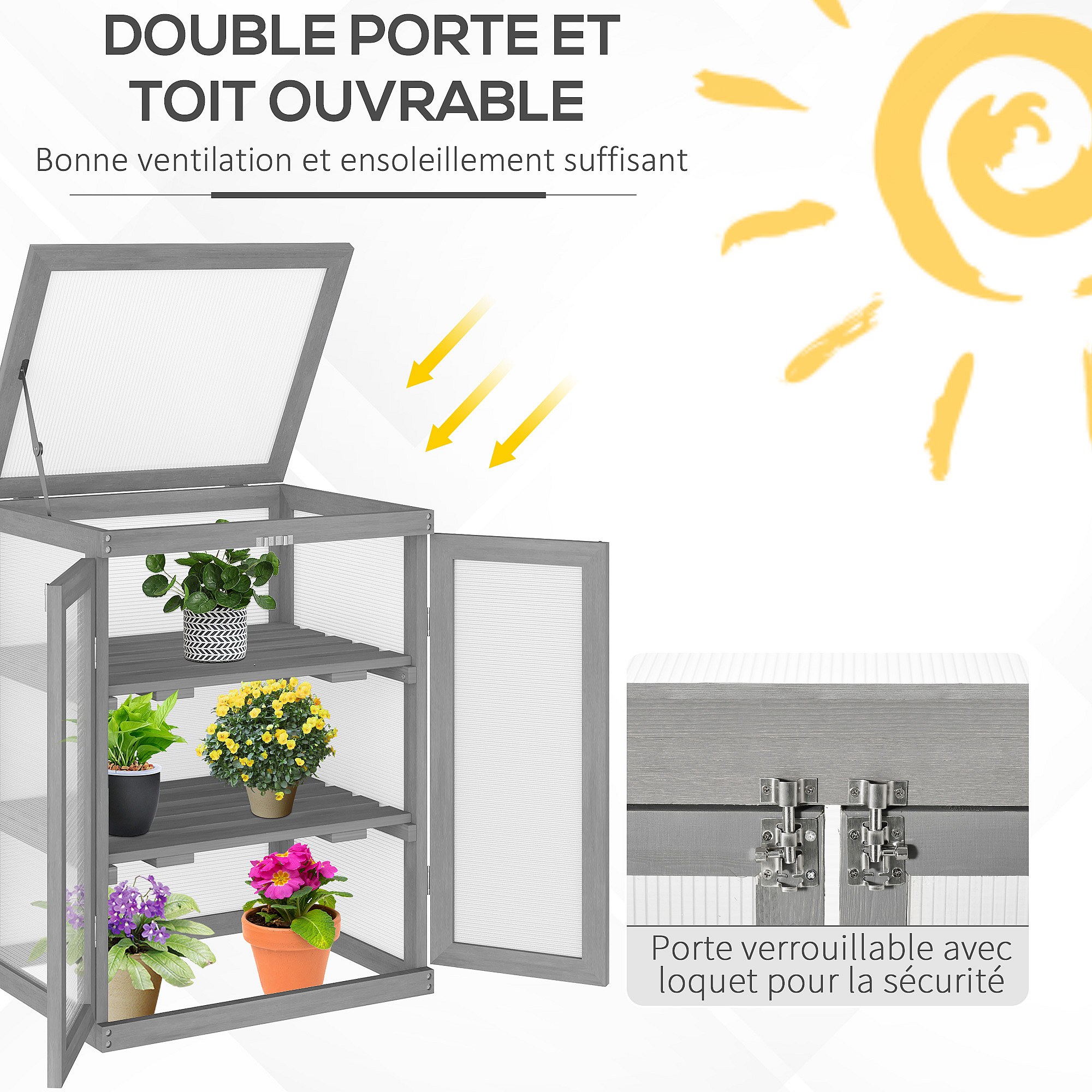 Mini serre de jardin 3 niveaux dim. 58L x 44l x 78H cm double porte toit ouvrant bois sapin lasuré peint gris polycarbonate
