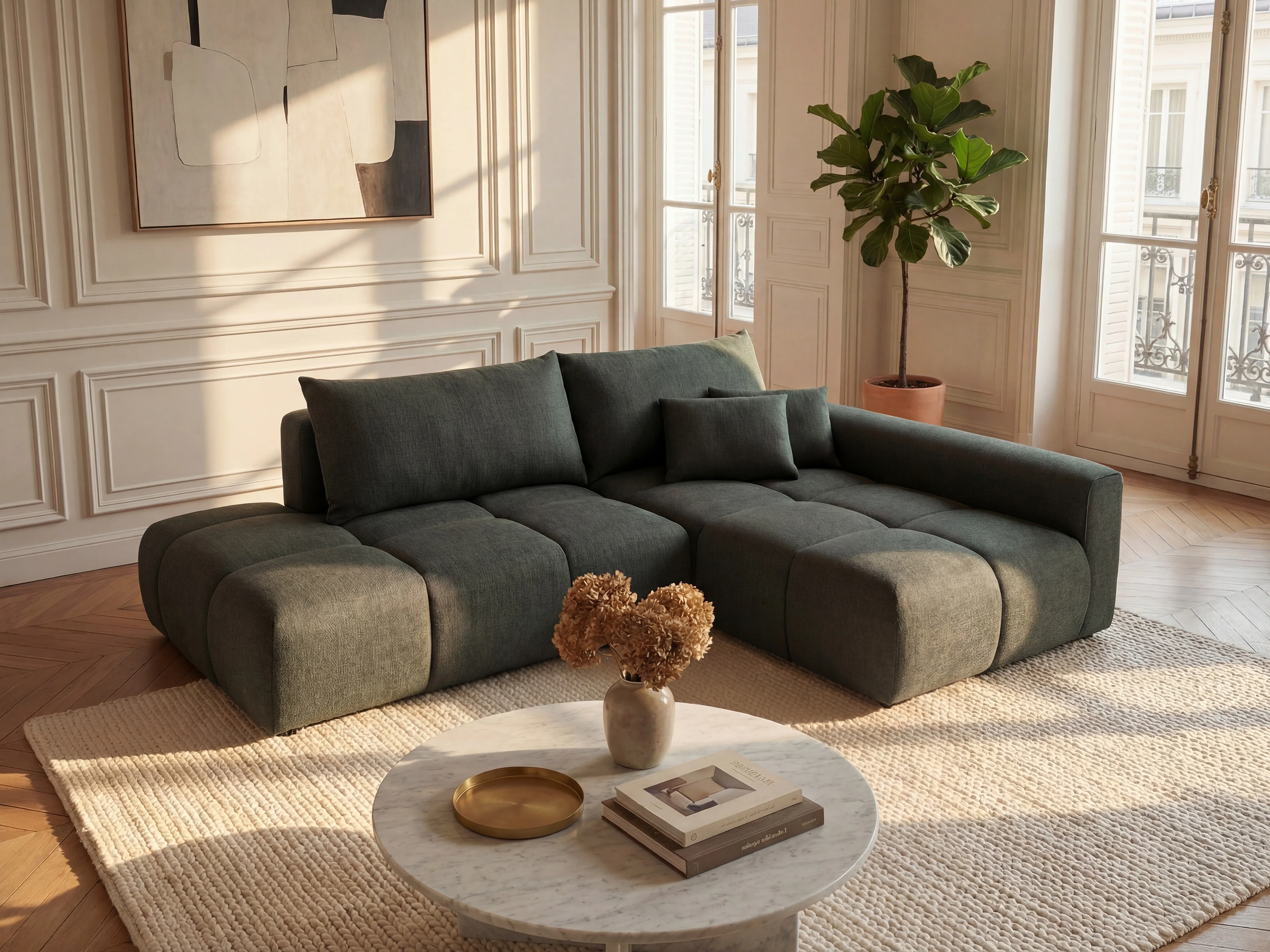 Canapé d'angle droit ouvert convertible en tissu texturé vert MINTURNO