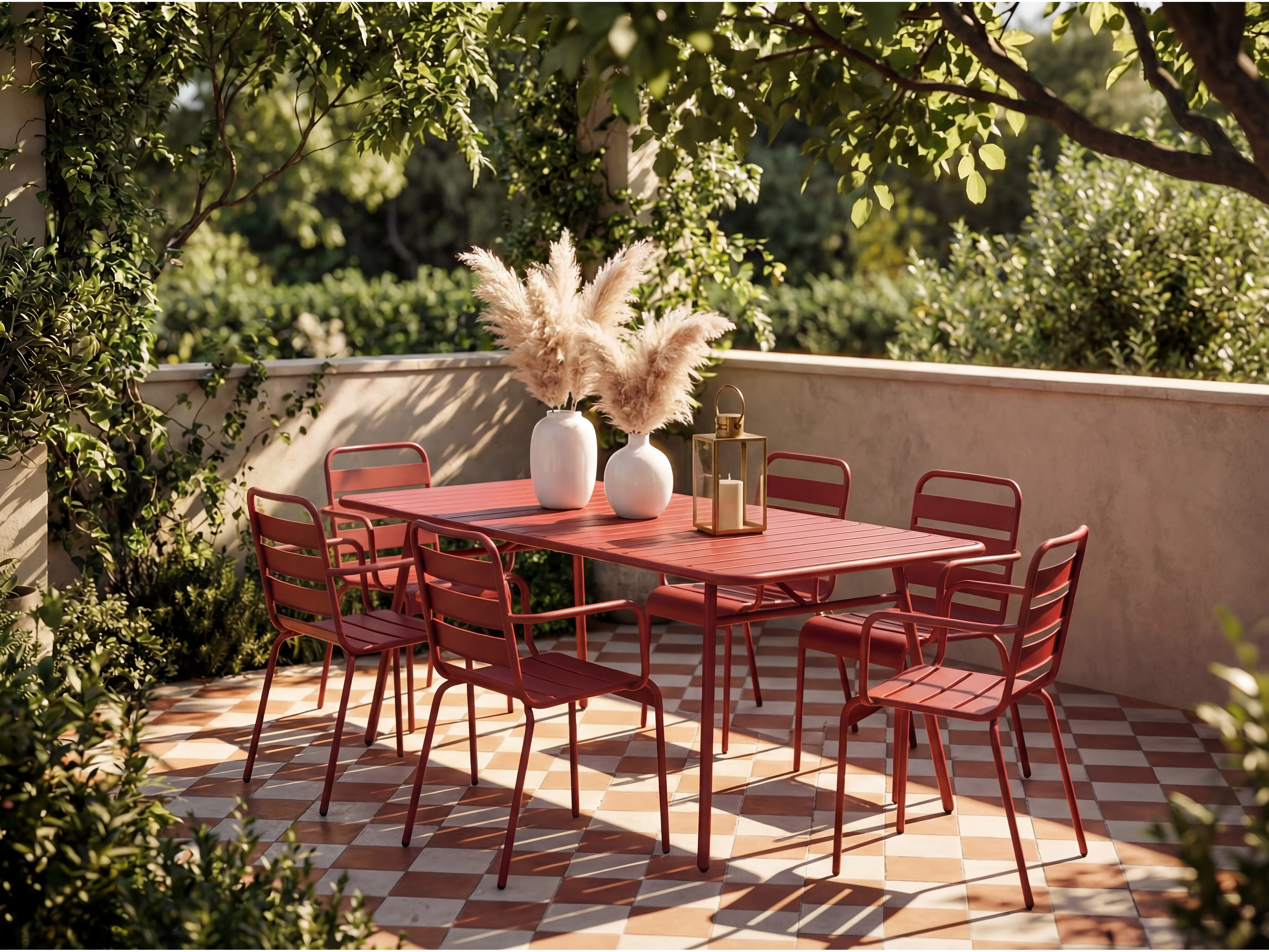 Salle à manger de jardin en métal - une table L.160 cm et 6 fauteuils empilables - Rouge - MIRMANDE de MYLIA