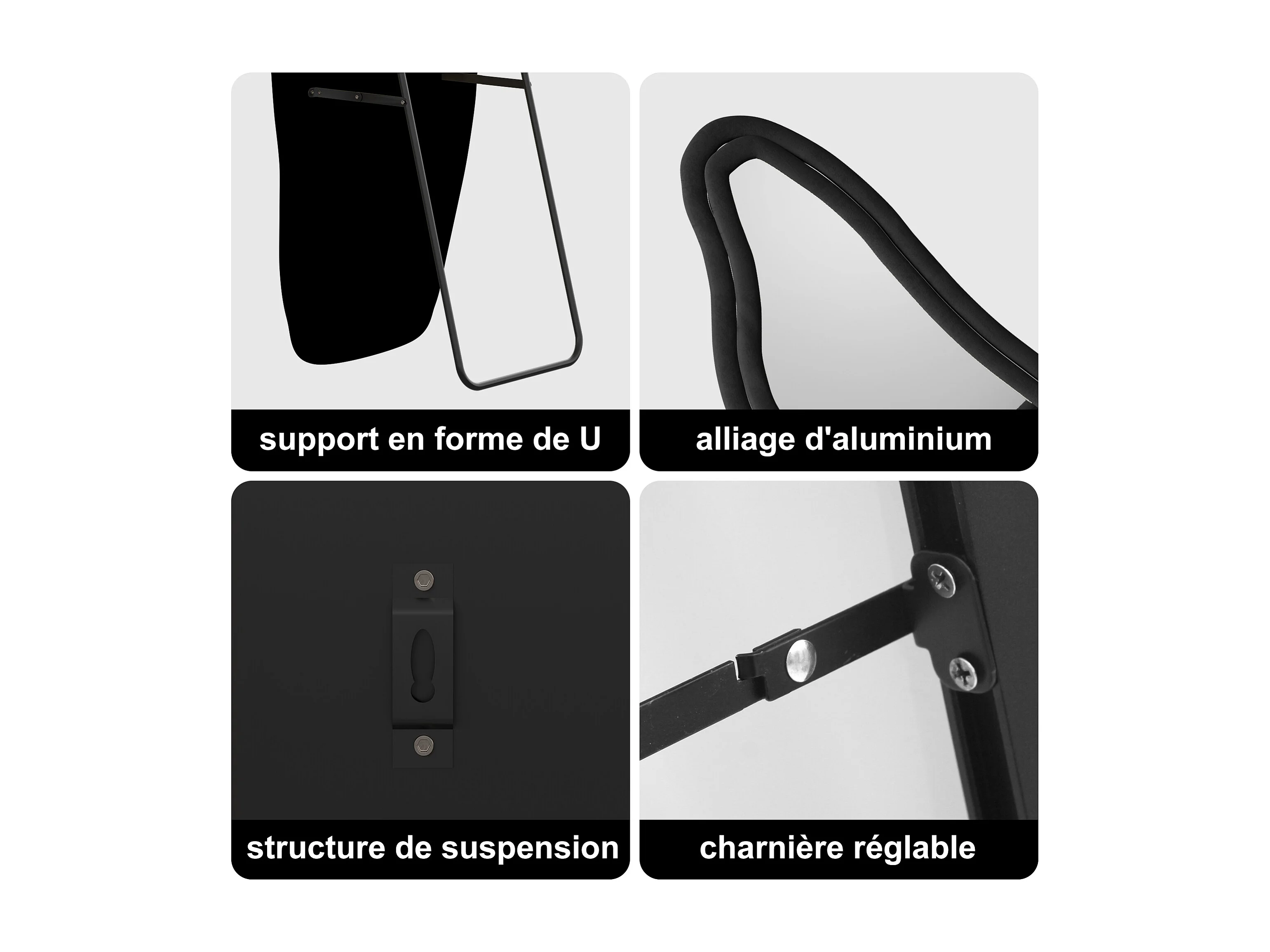 Miroir à corps complet - 160 x 50 x 3 cm - Forme incurvée irrégulière - avec cadre en flanelle - noir