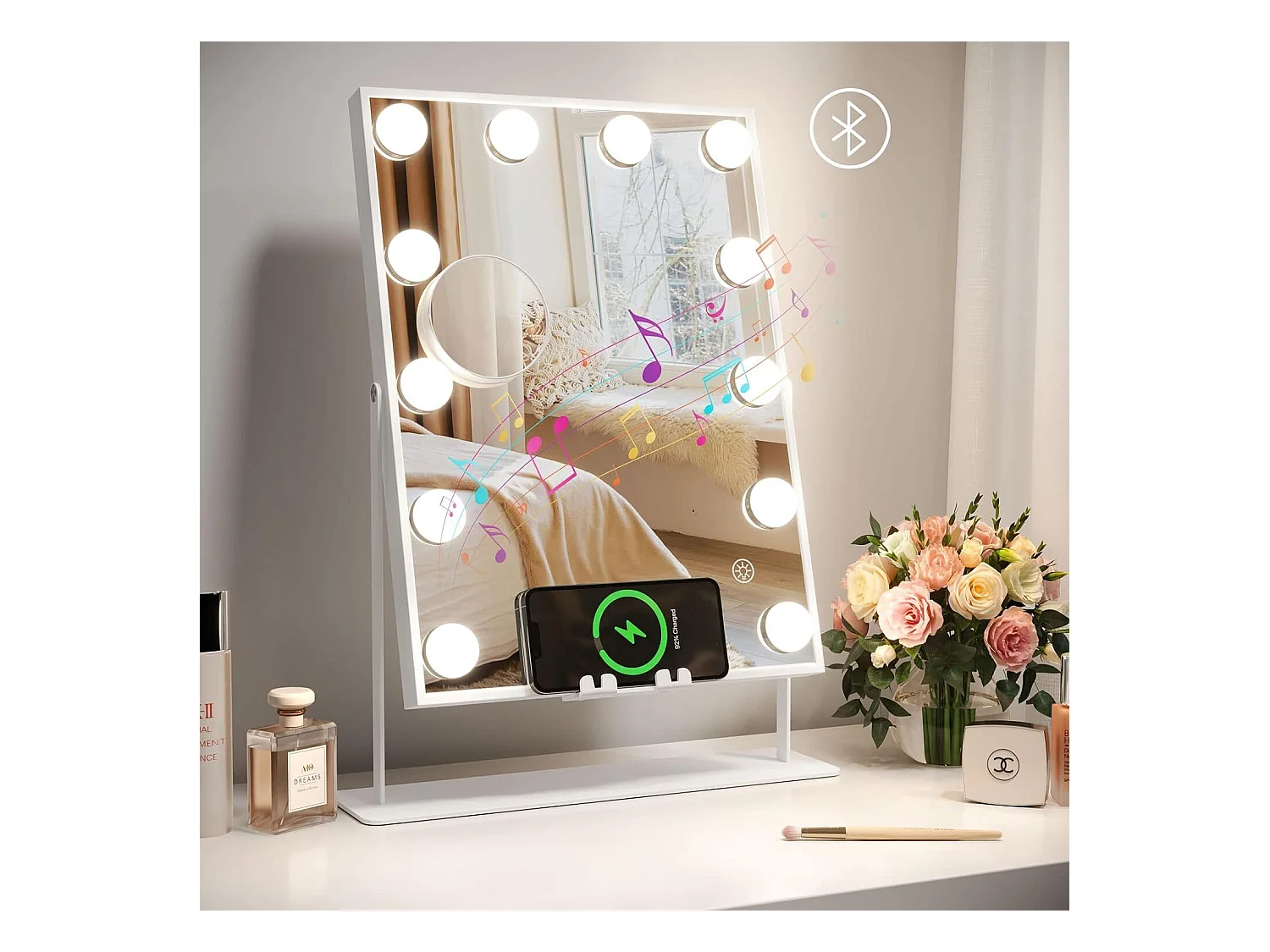 Miroir de maquillage intelligent Avec Bluetooth et miroir LED rechargeable sans fil 12 ampoules LED dimmables blanc 30cm x 41cm