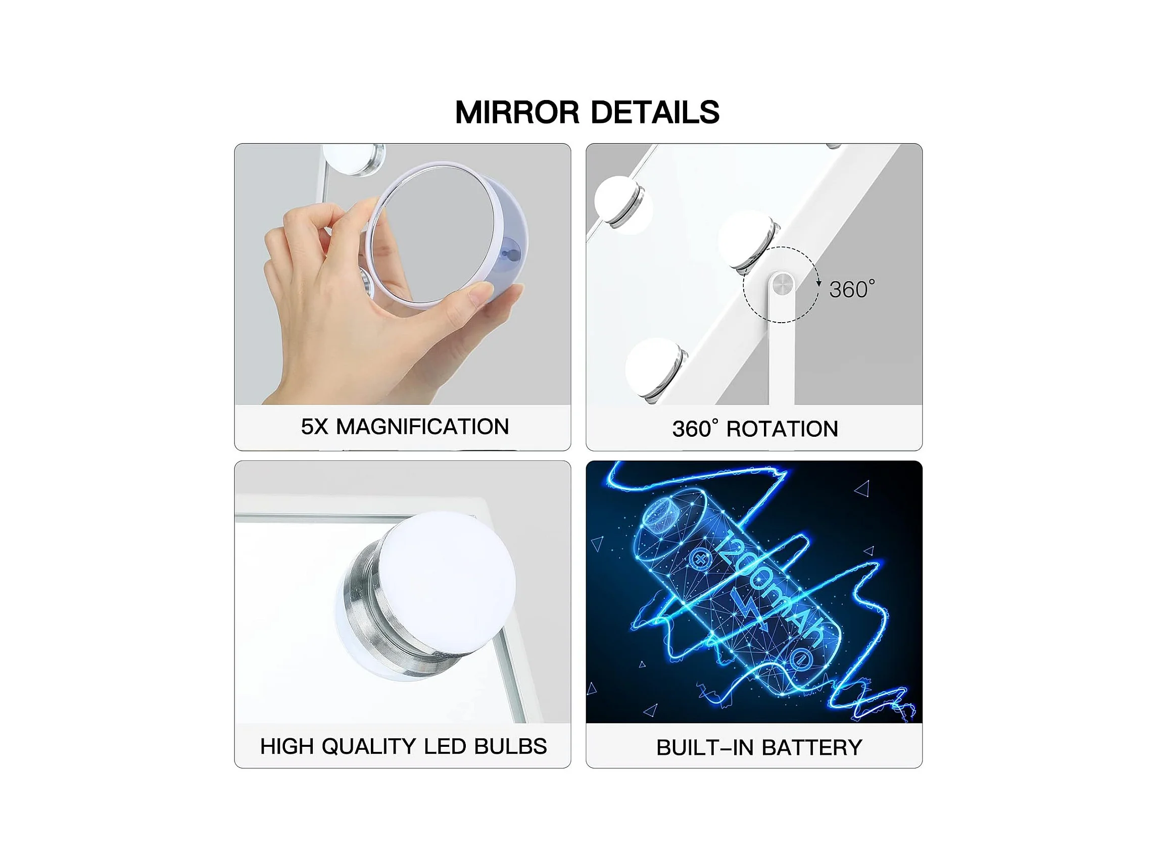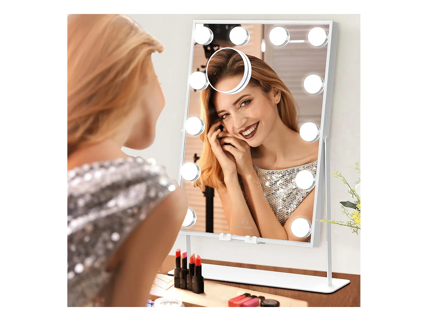 Miroir maquillage Hollywood lumineux LED intensité réglable grossissant rotatif charge USB support blanc