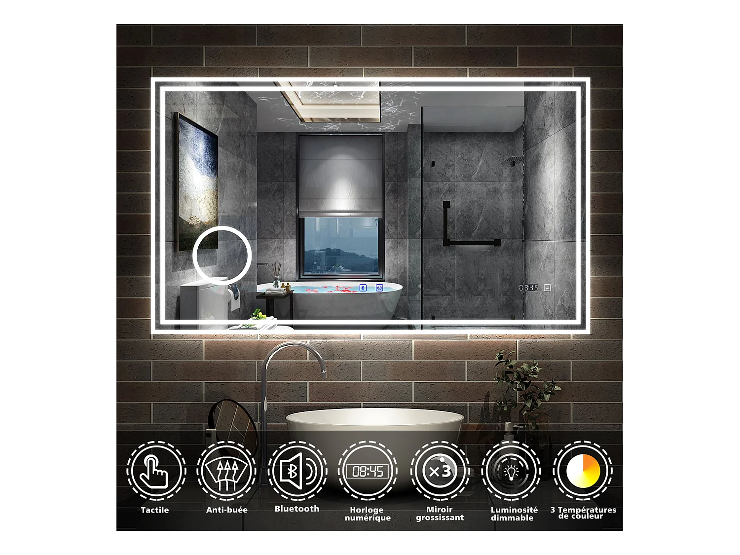 Miroir Salle de Bain LED 120x70cm avec Bluetooth, Horloge, 3 Couleurs, Grossissant 3x Aica