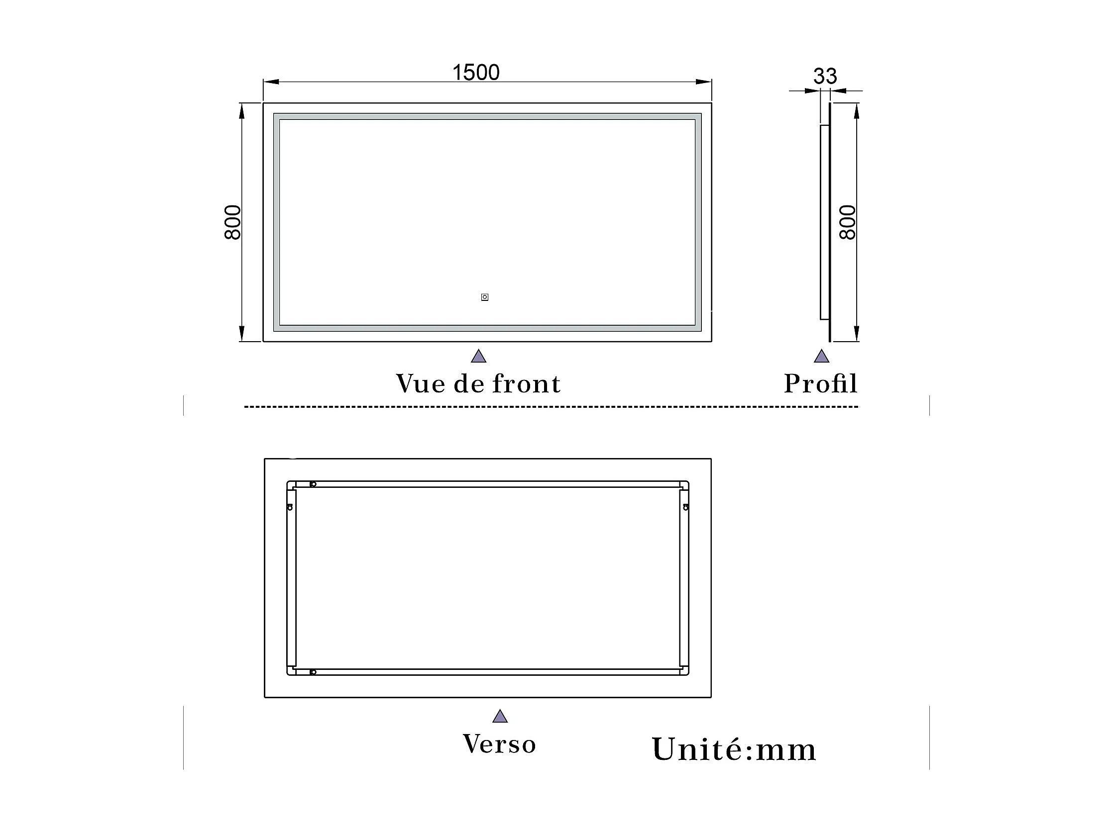 Miroir de salle de bain lumineux L.150 x H.80 cm avec Anti-Buée + 3 Couleurs + Dimmable, Miroir LED Mural