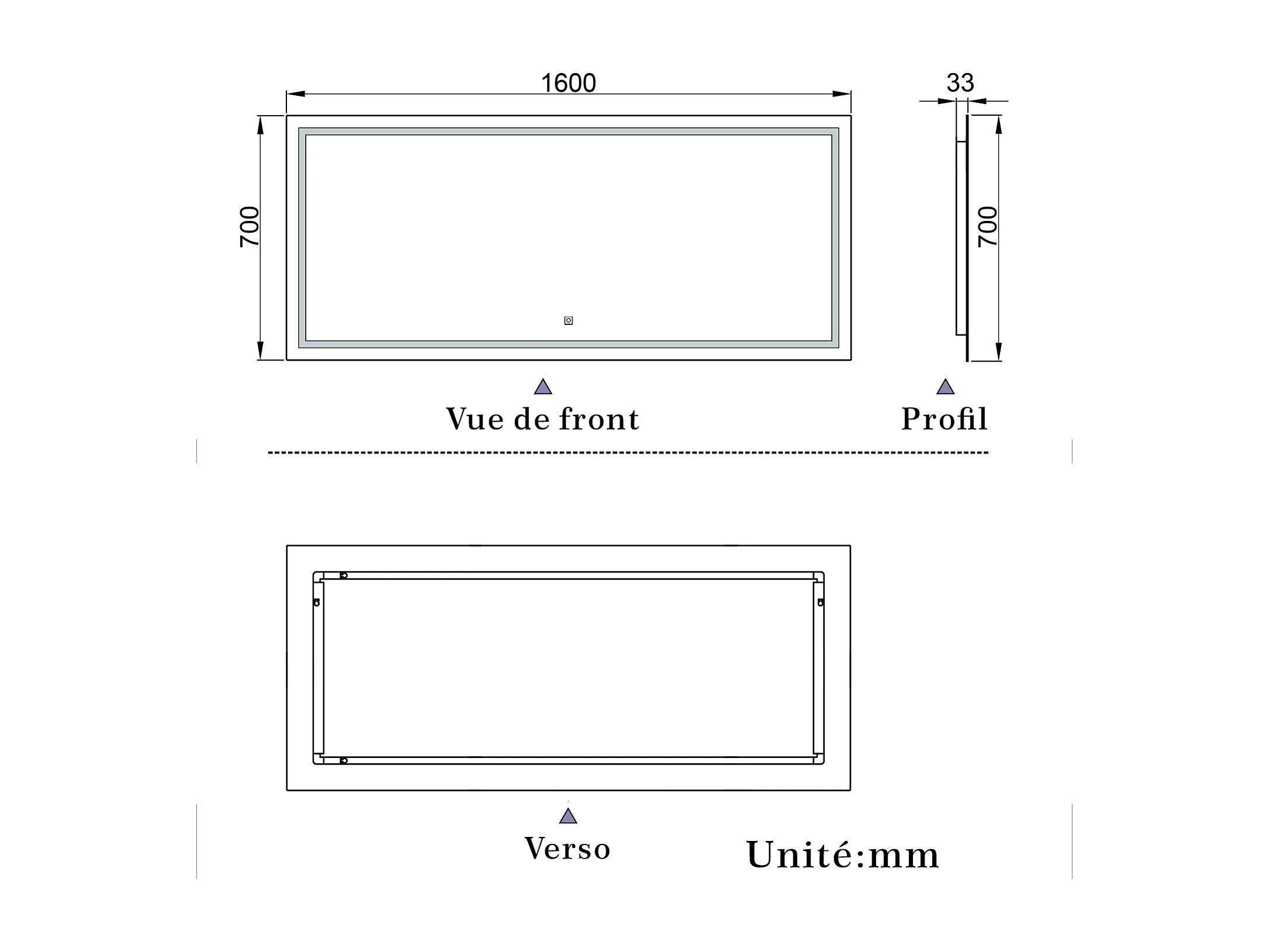 Miroir de salle de bain lumineux L.160 x H.70 cm avec Dimmable + Mémoire + D'arrêt automatique, Miroir LED Mural