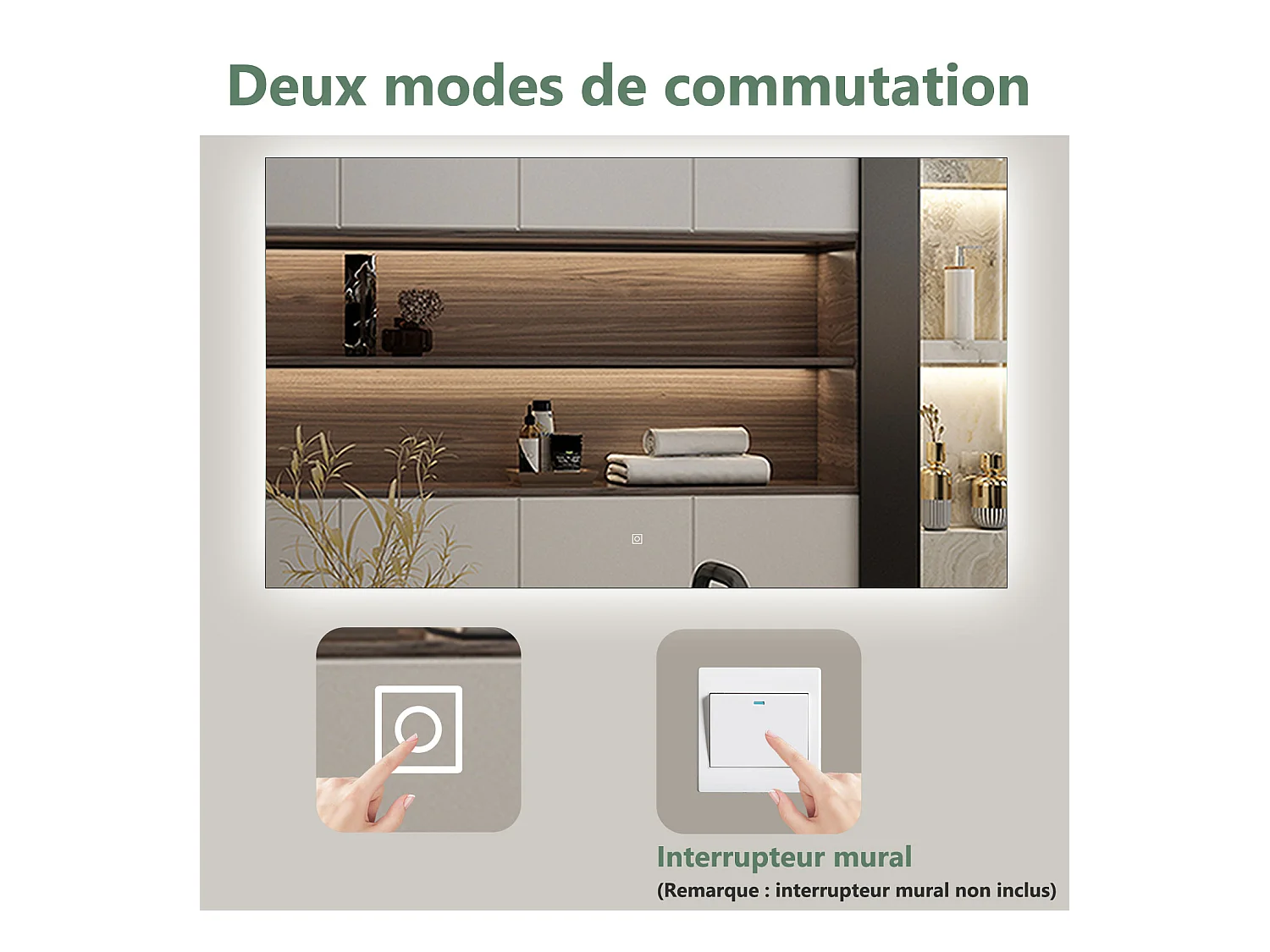 Miroir LED 90x70cm avec Anti-buée + Dimmable, Mural Miroir salle de bain