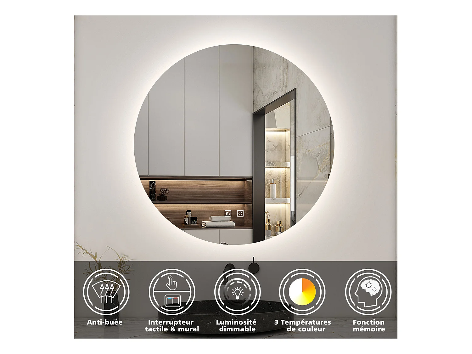 AICA Miroir de salle de bain rond 70x70cm LED tricolore anti-buée + mémoire + dimmable