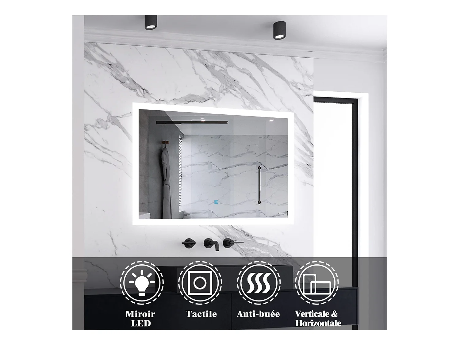 Miroir lumineux l.80 x H.60cm avec Anti-buée, Mural Miroir salle de bain - Aica