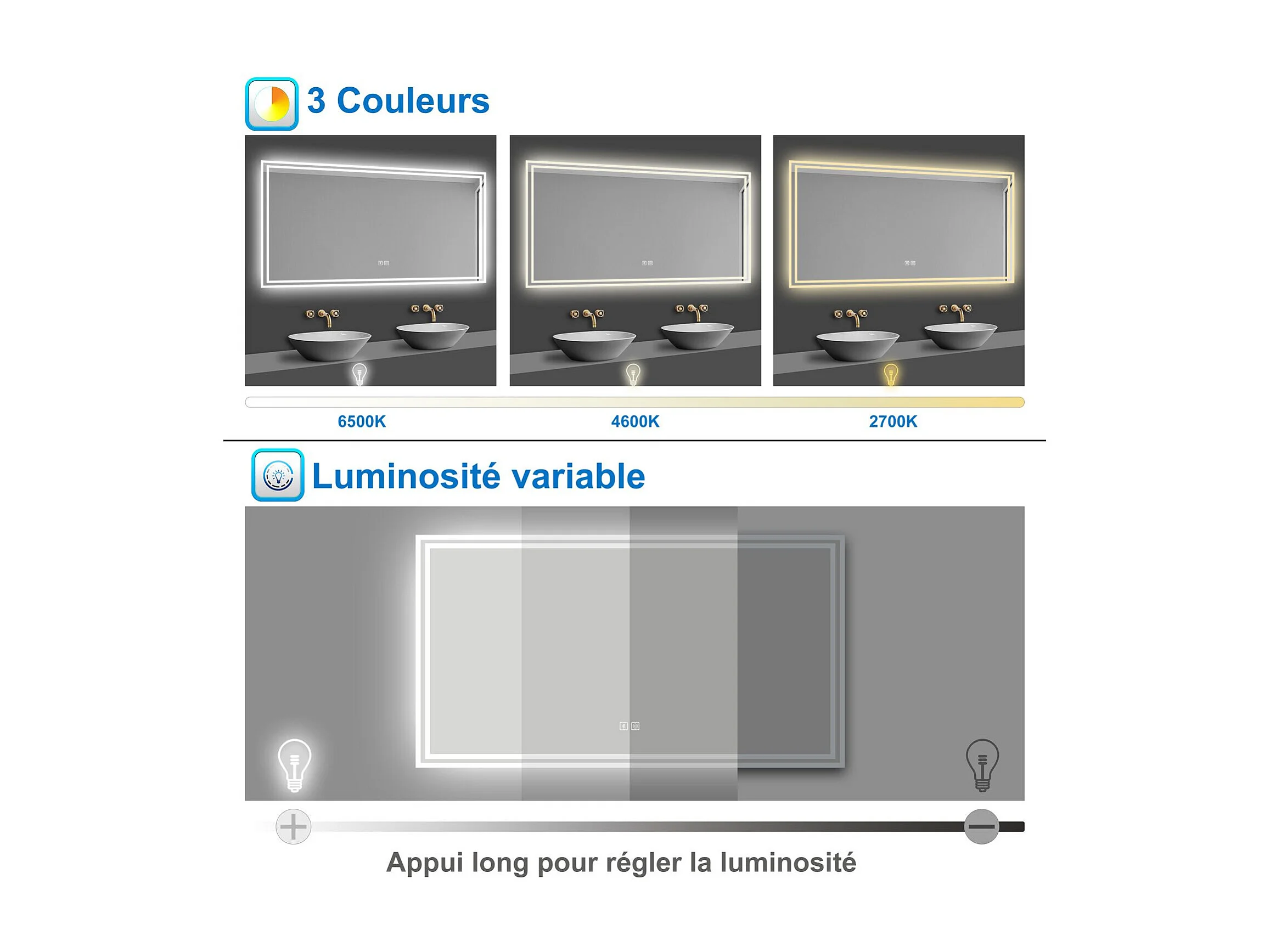 Miroir lumineux avec Bluetooth 80 x 60cm, Miroir de salle de bain à LED antibuée, fonction de gradation à 3 couleurs Miroir mural IP44 rectangulaire