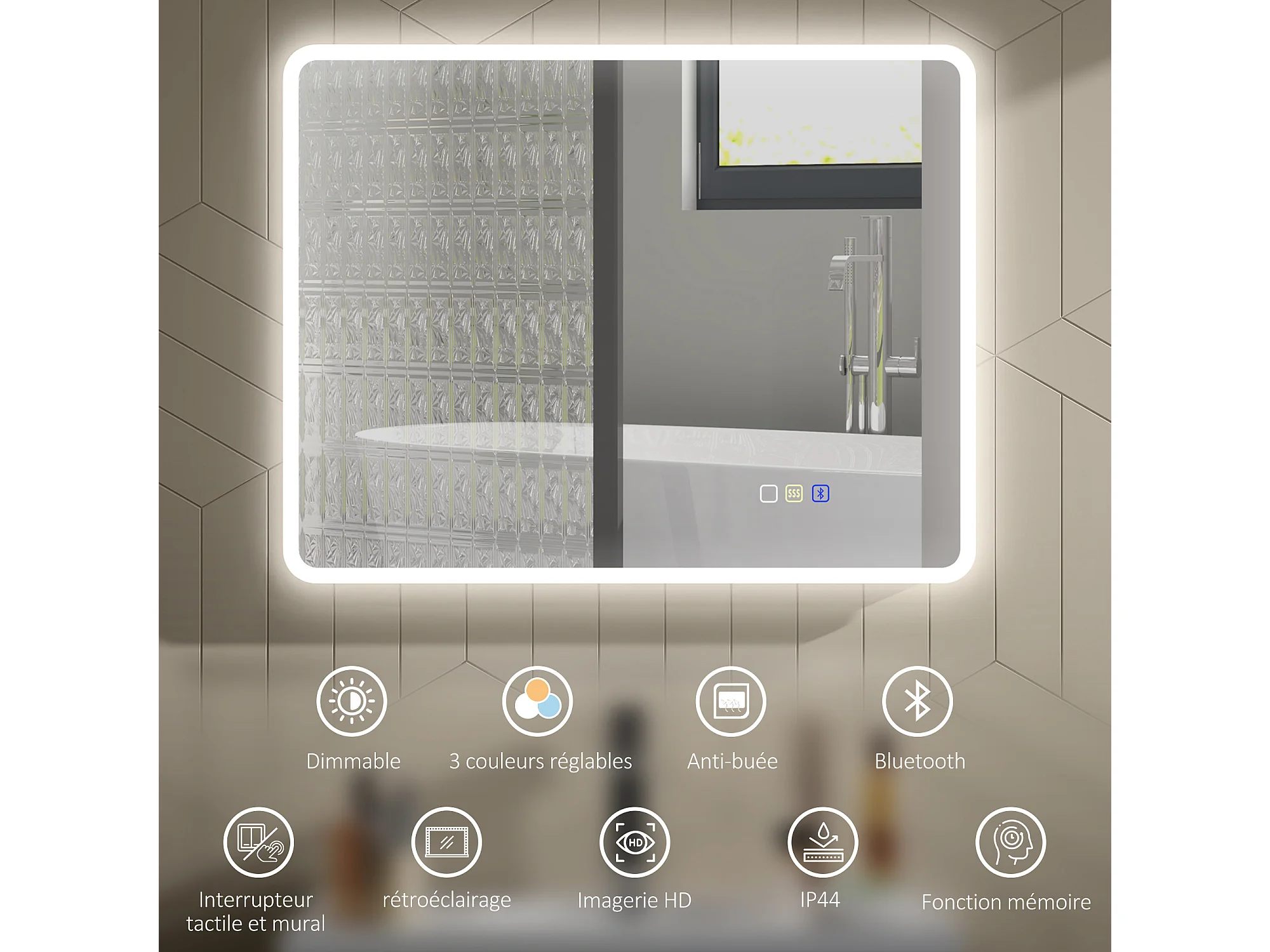 Miroir lumineux LED salle de bain 90 x 70 cm bluetooth interrupteur tactile lumière réglable 3 couleurs fonction anti-buée et mémoire