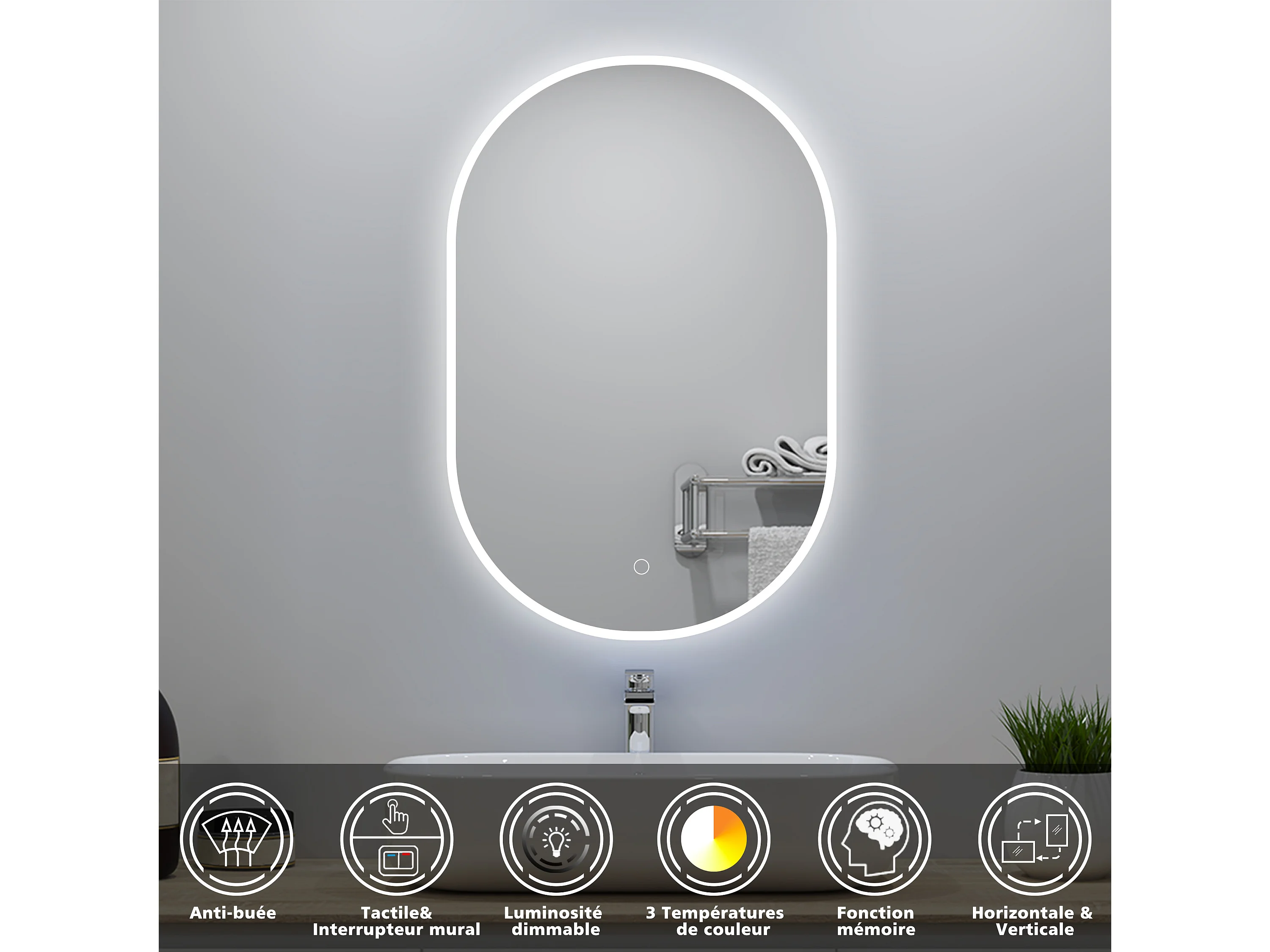 Miroir lumineux ovale l.50 x H.70cm avec Anti-buée + Dimmable, Mural Miroir salle de bain