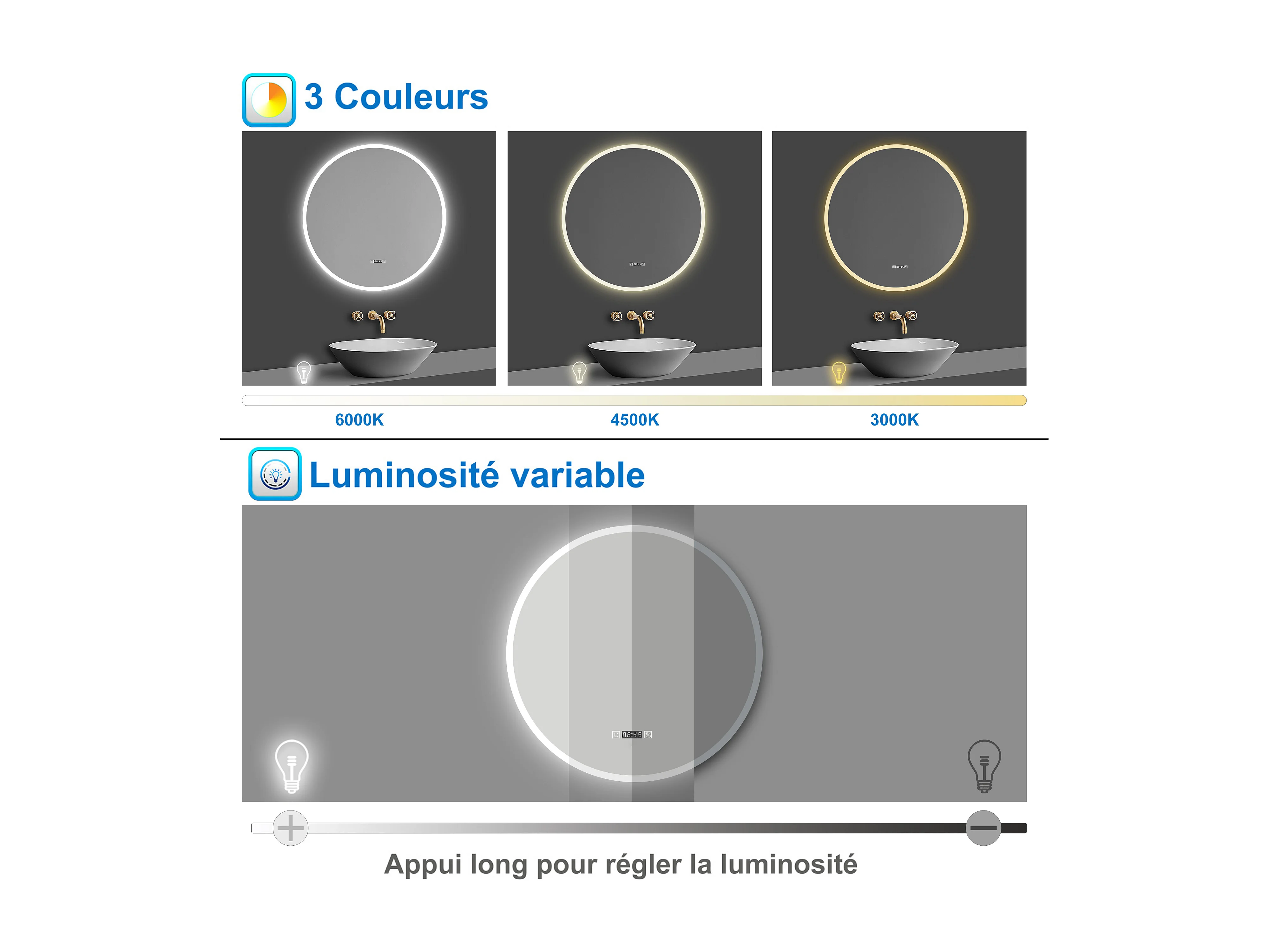 Miroir lumineux Rond 80cm avec Horloge + 3 Couleurs + Dimmable + Anti-buée