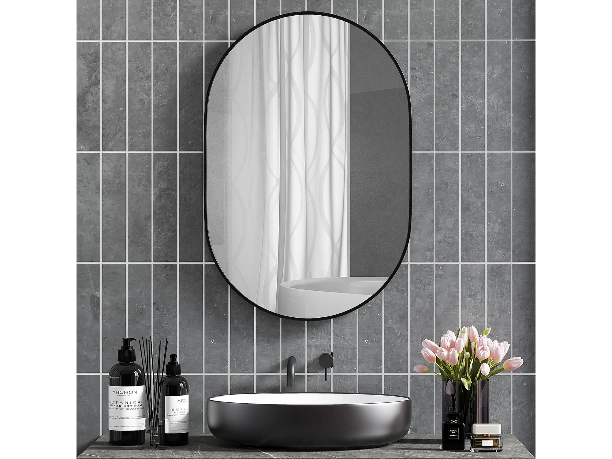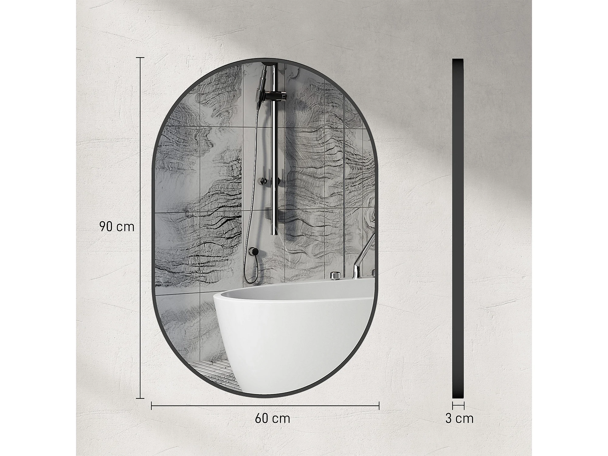 Miroir mural ovale dim. 60L x 90H cm cadre arrondi montage vertical/horizontal alu. noir