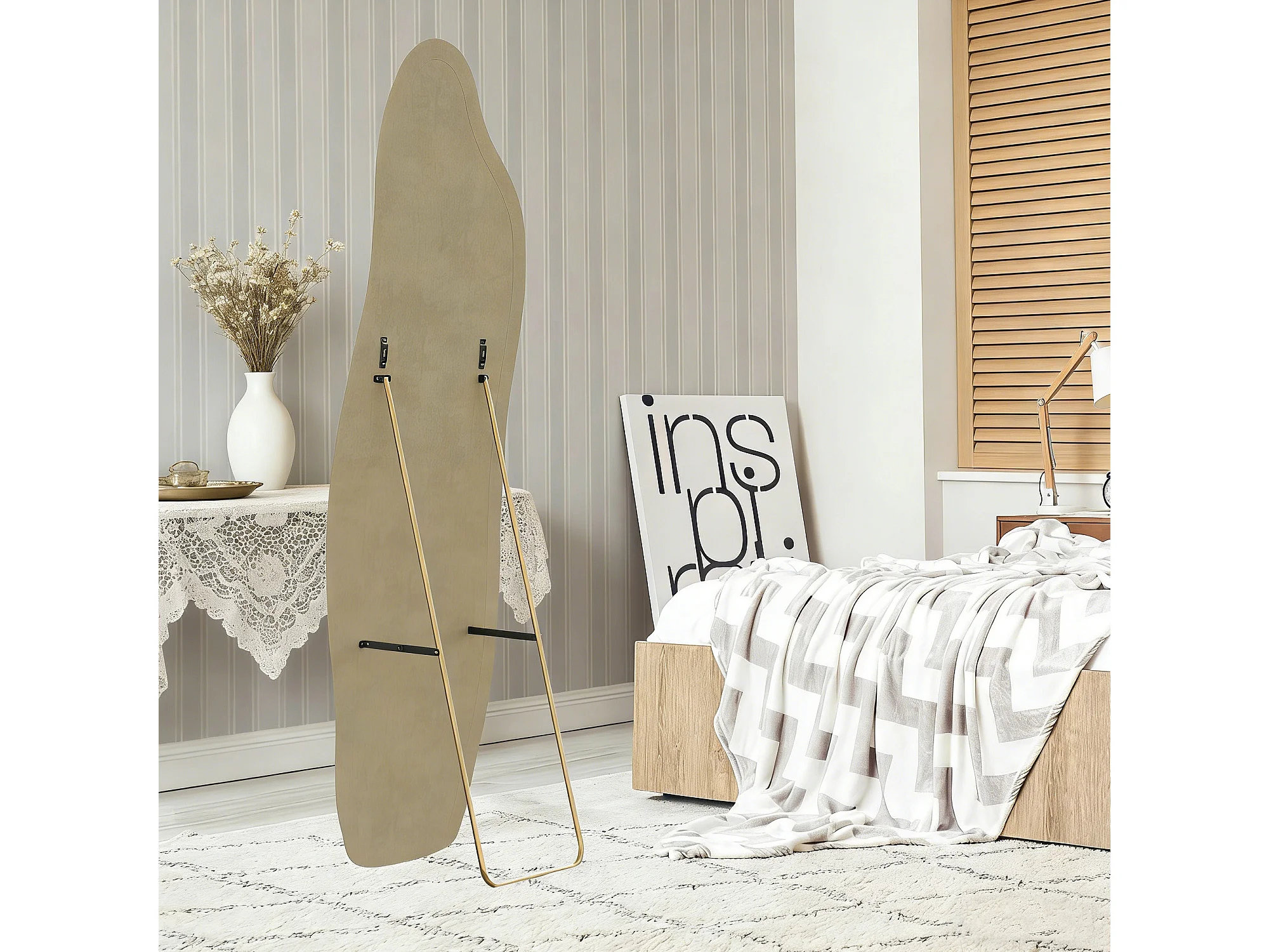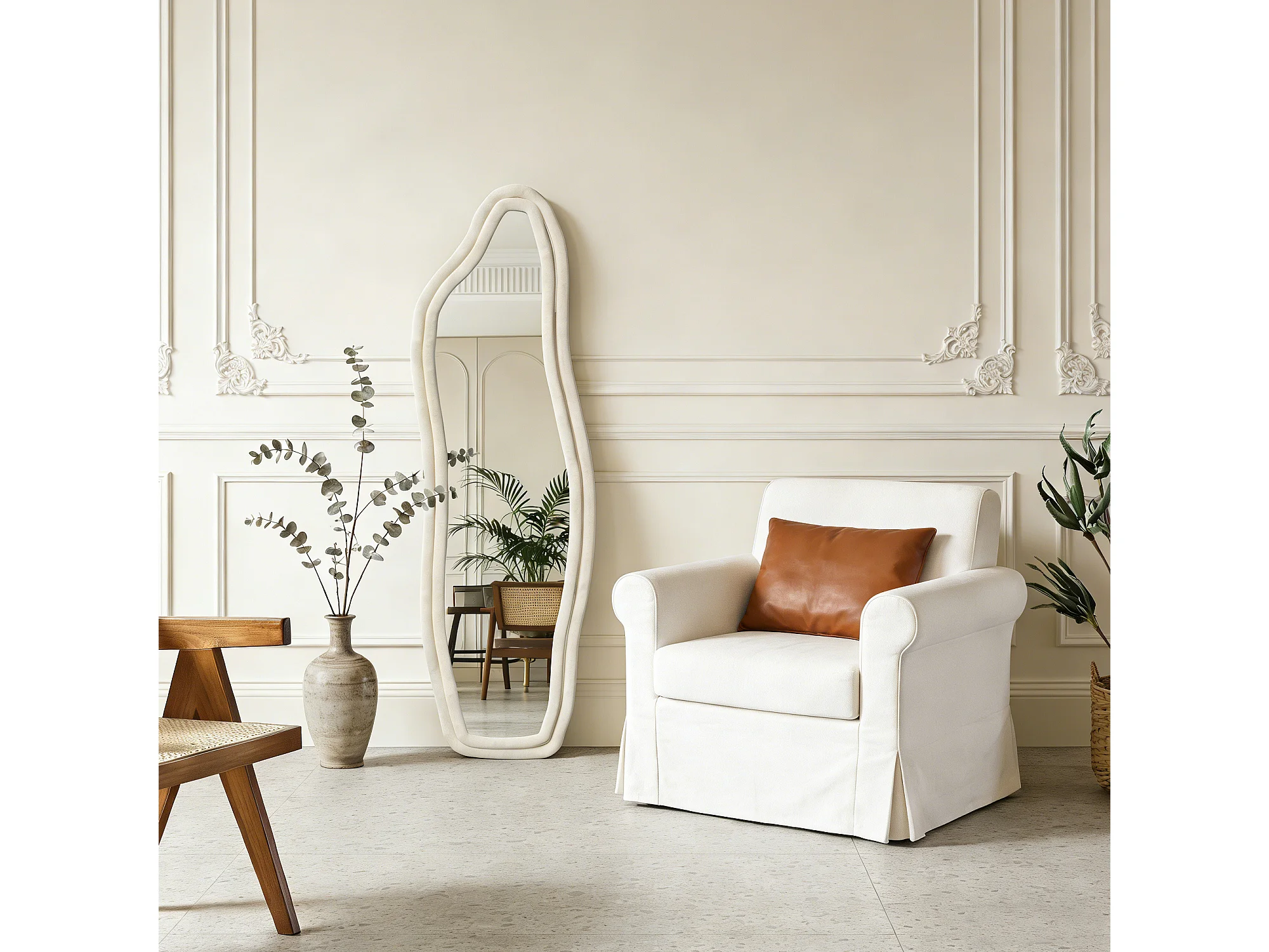 Miroir organique en tissu Velours de cristal, Miroir sur pied, monté au mur, Miroir debout à bord ondulé 140x45 cm, Verre trempé haute définition, blanc
