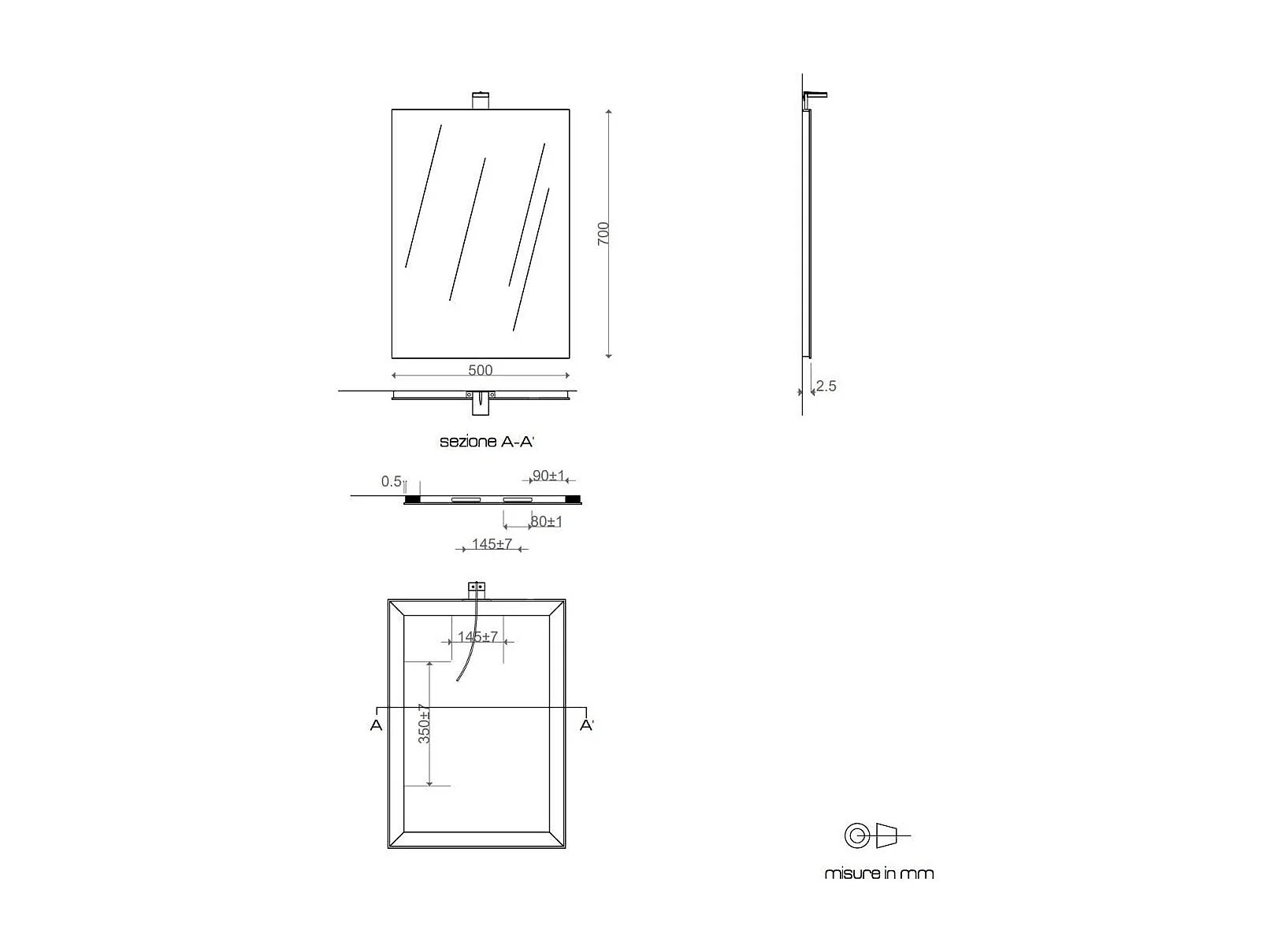 Miroir Rectangulaire Cm 50X70 Réversible Complet De Lampe À Led