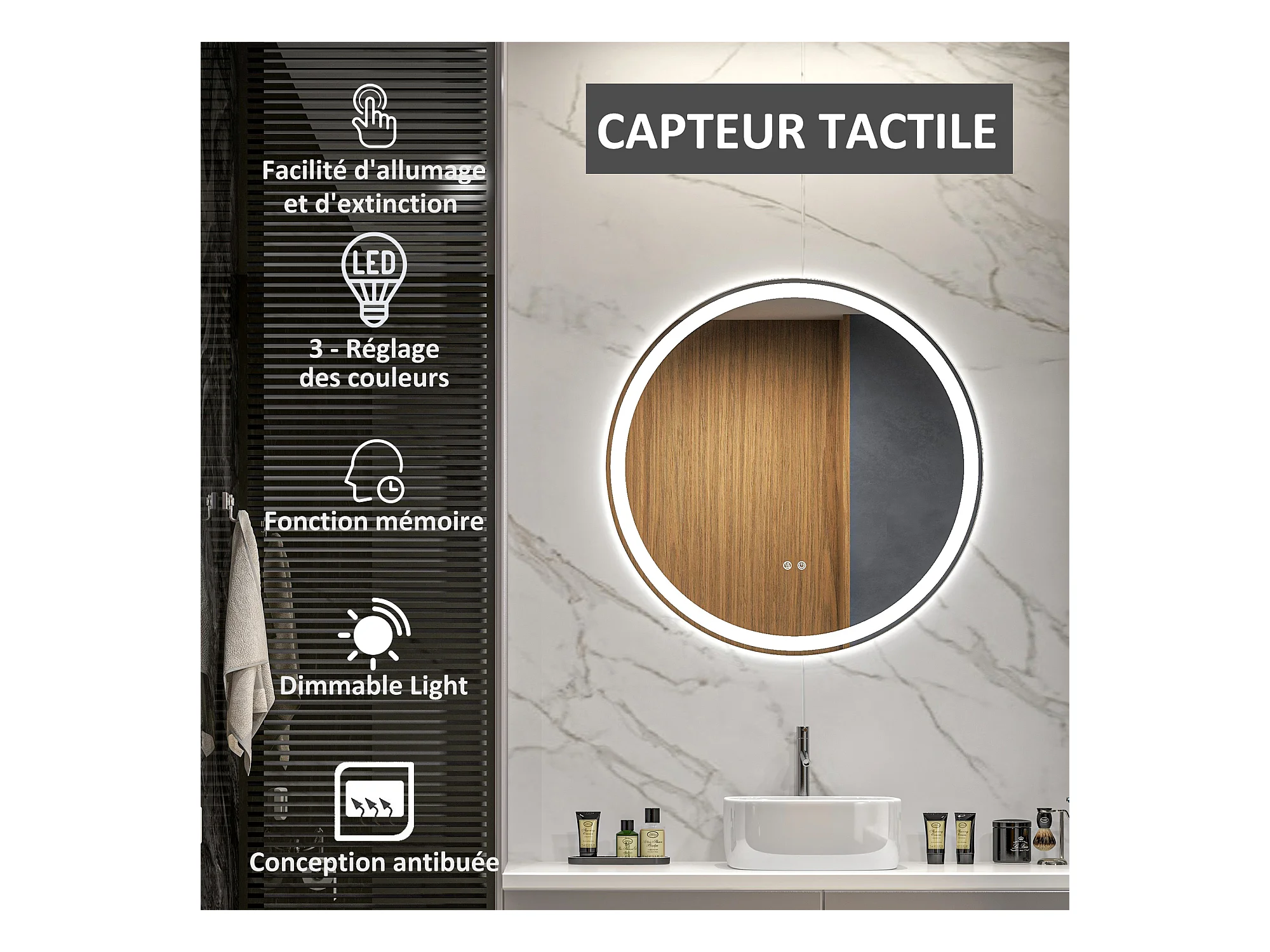 Miroir rond lumineux LED de salle de bain 29 W Ø 60 cm tactile antibuée blanc argent