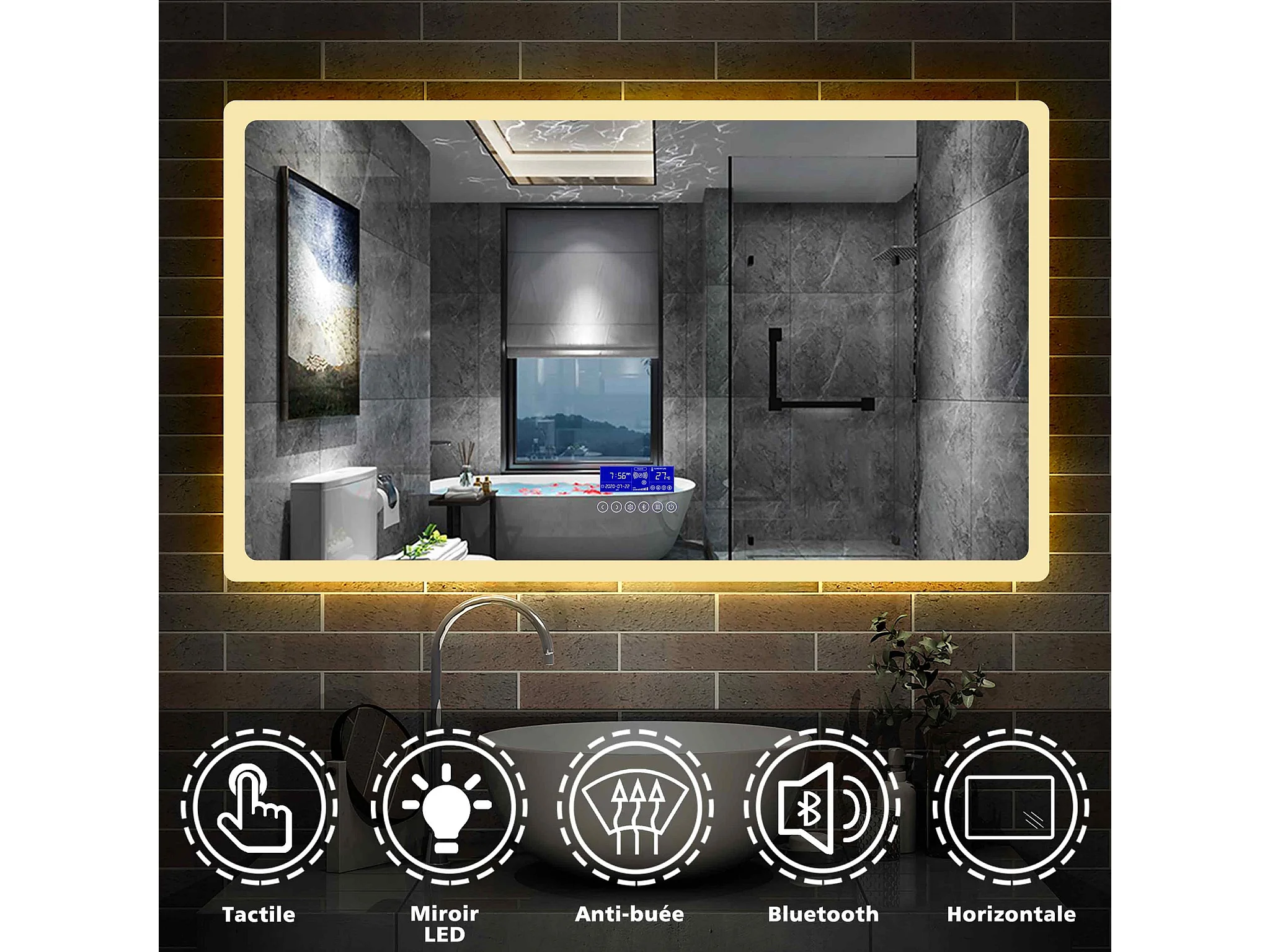 Miroir Salle de Bain Anti-buée LED 80 x 60 cm de 3 Couleurs avec Bluetooth, Horloge Aica