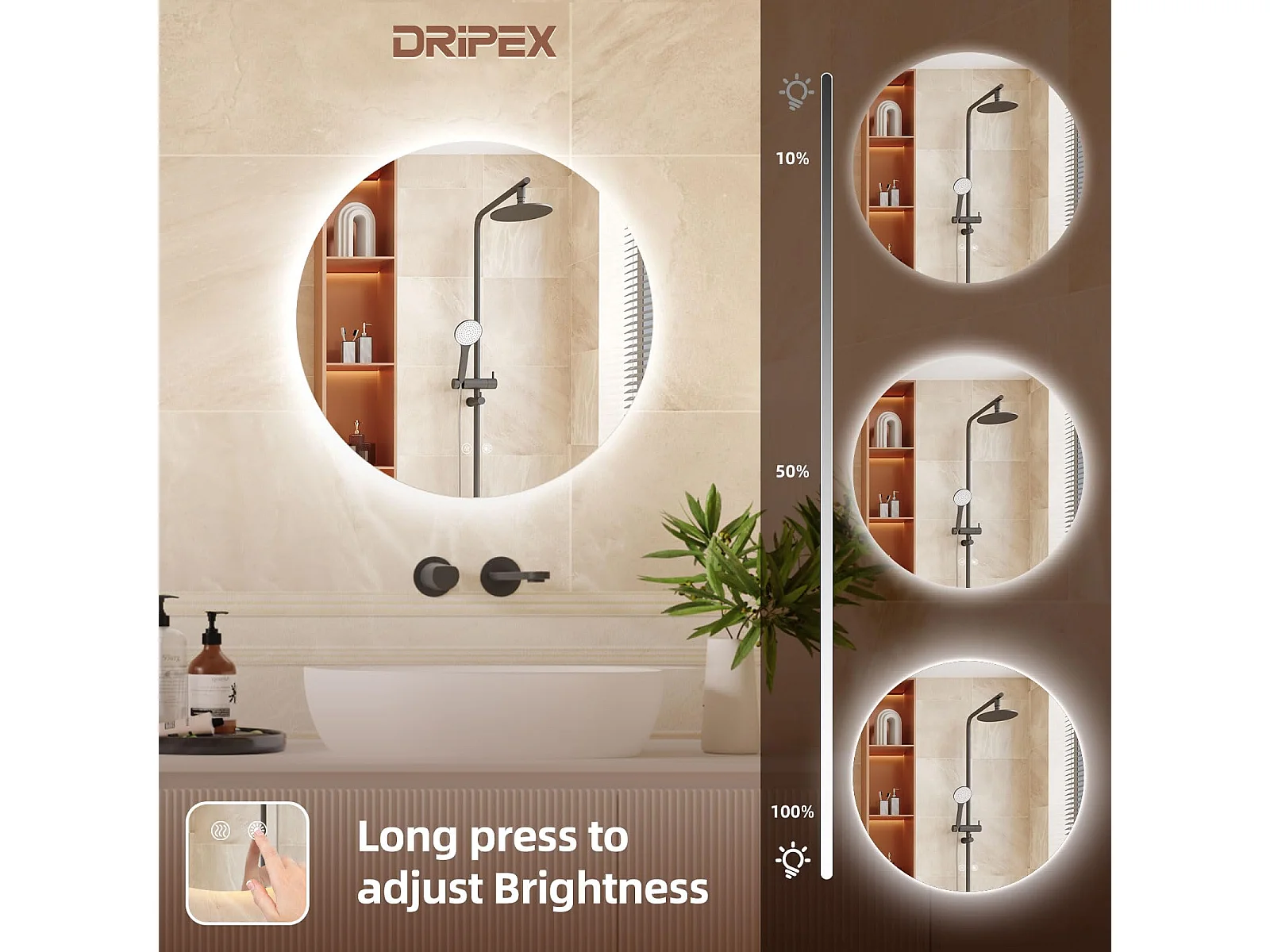 Miroir Salle de Bain LED Rond 50cm avec Anti-buée, 3 Couleurs Dimmable, Mémoire, Verre Trempé HD, Capteur Tactile, IP44