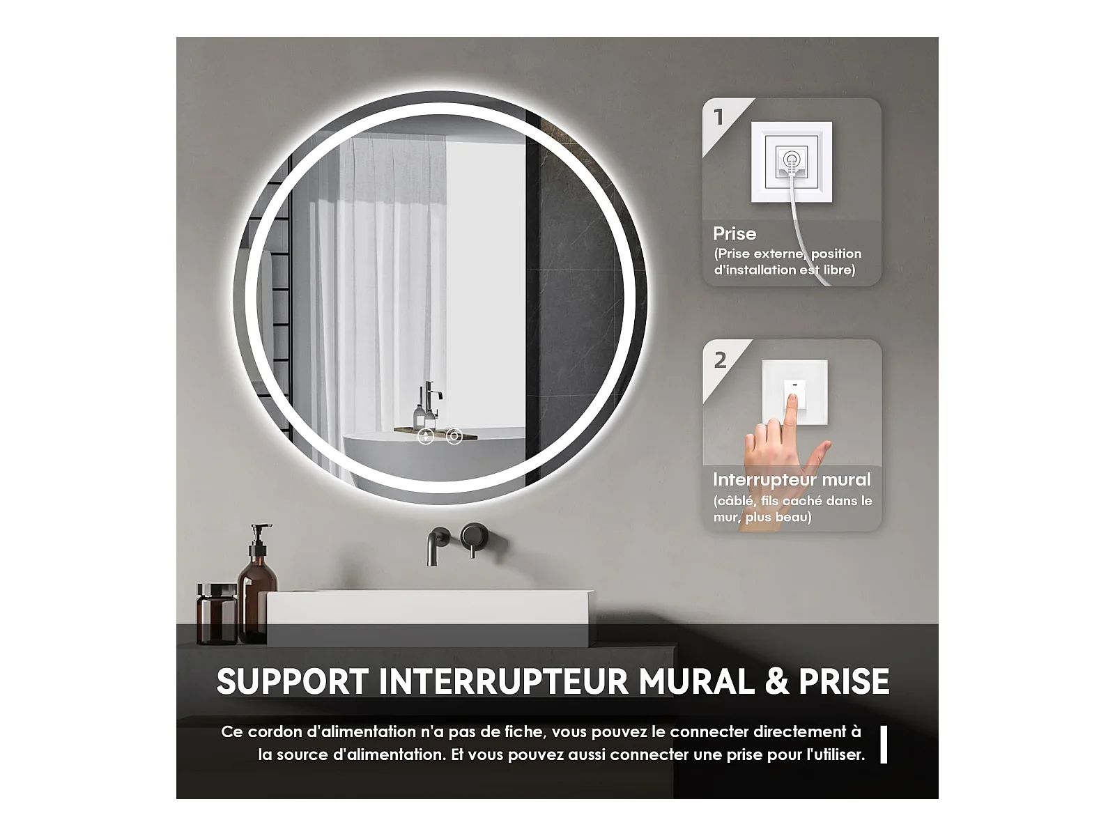 Miroir lumineux rond 80cm avec 3 Couleurs + Dimmable + Anti-buée, Mural Miroir salle de bain