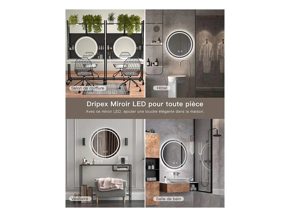 Miroir de salle de bain, affichage de la température, fonction anti-buée, réglage de la luminosité, D100CM
