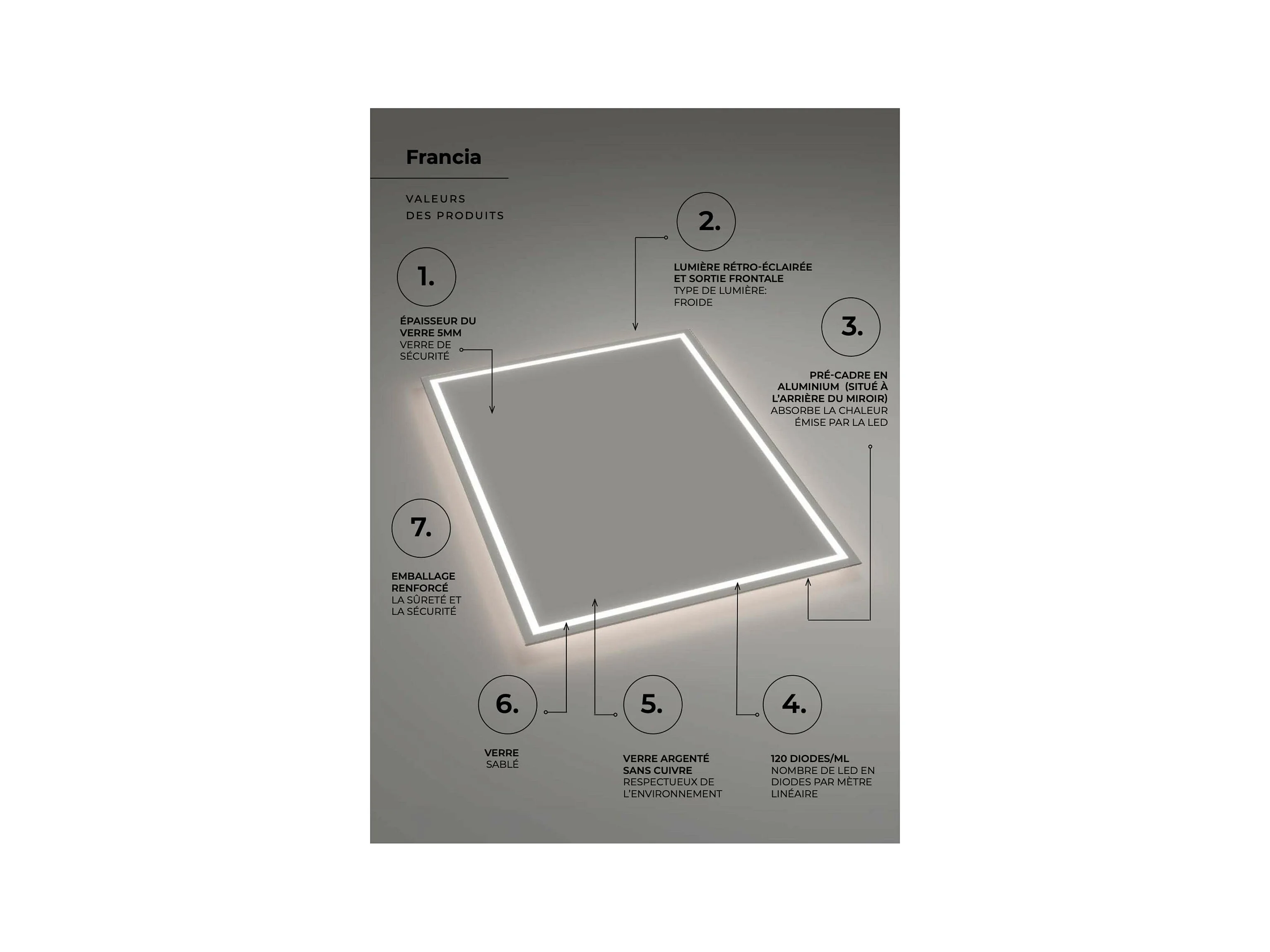 Miroir Salle de Bain FRANCIA - 120x80cm - Led Rétro-éclairé & Diffusion Frontal (6500K) - LEDIMEX