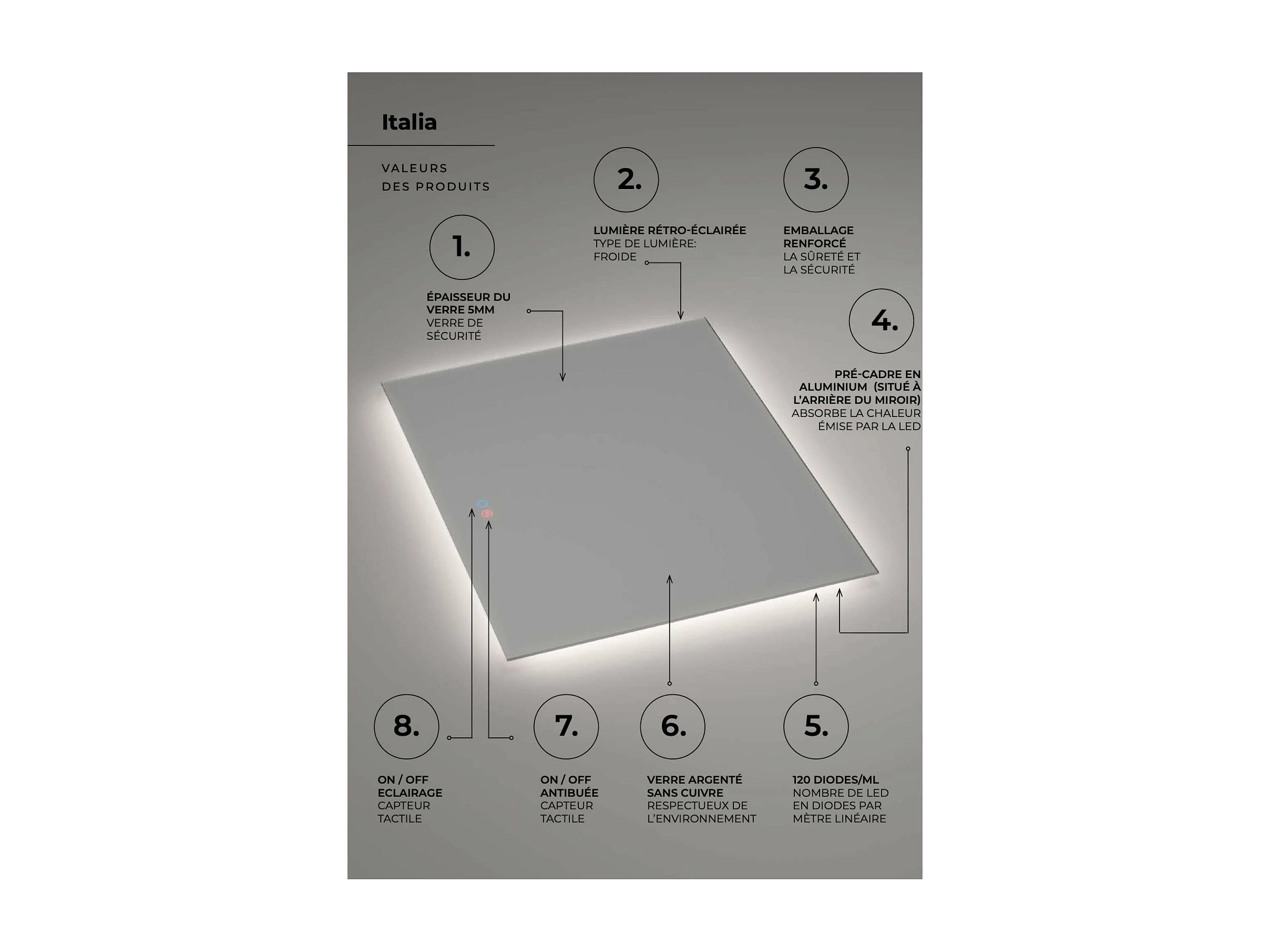 Miroir Salle de Bain ITALIA - 100x80cm - Led Rétro-éclairé (6500K) - Tactiles On/Off & Anti-Buée - LEDIMEX