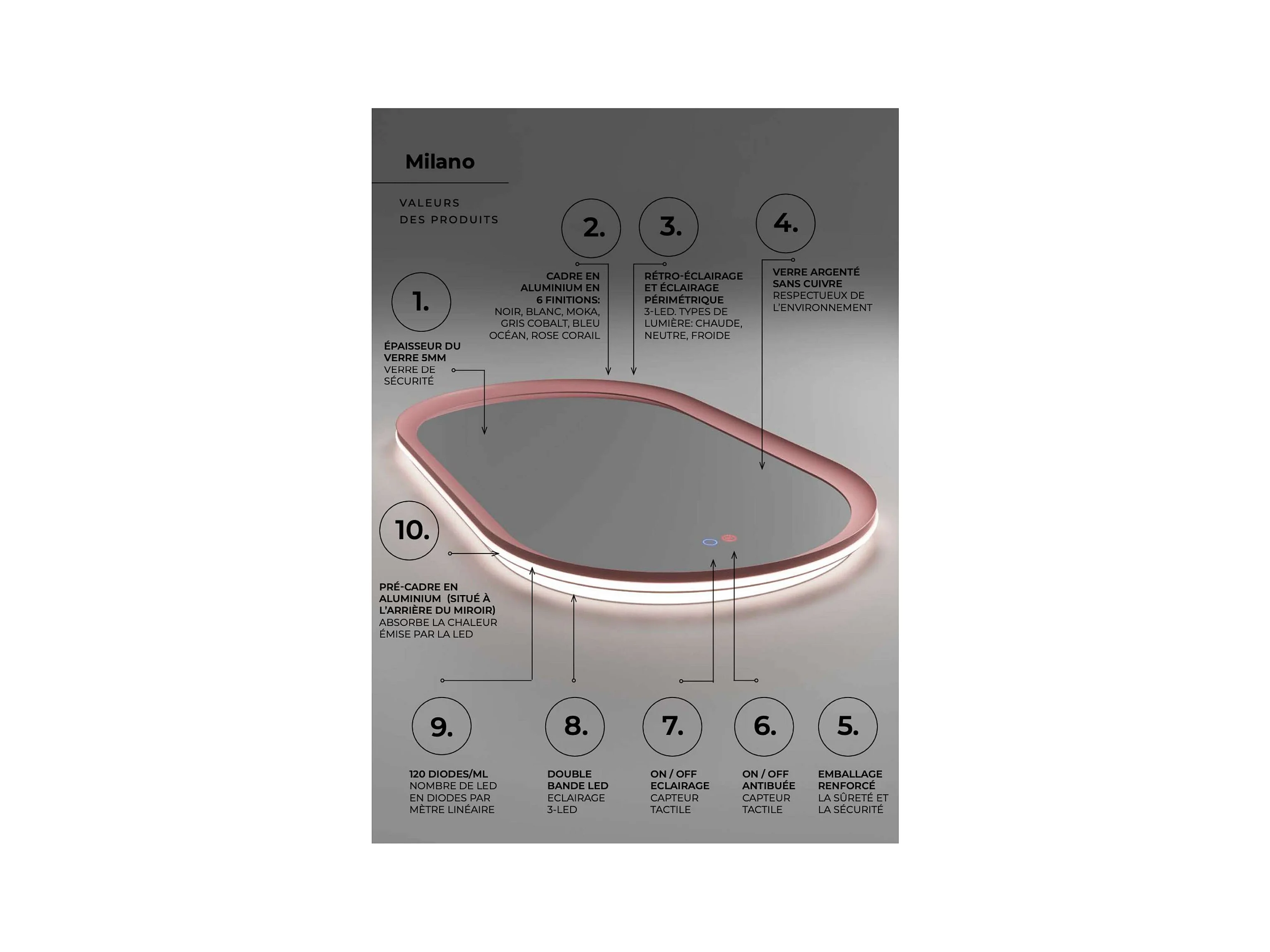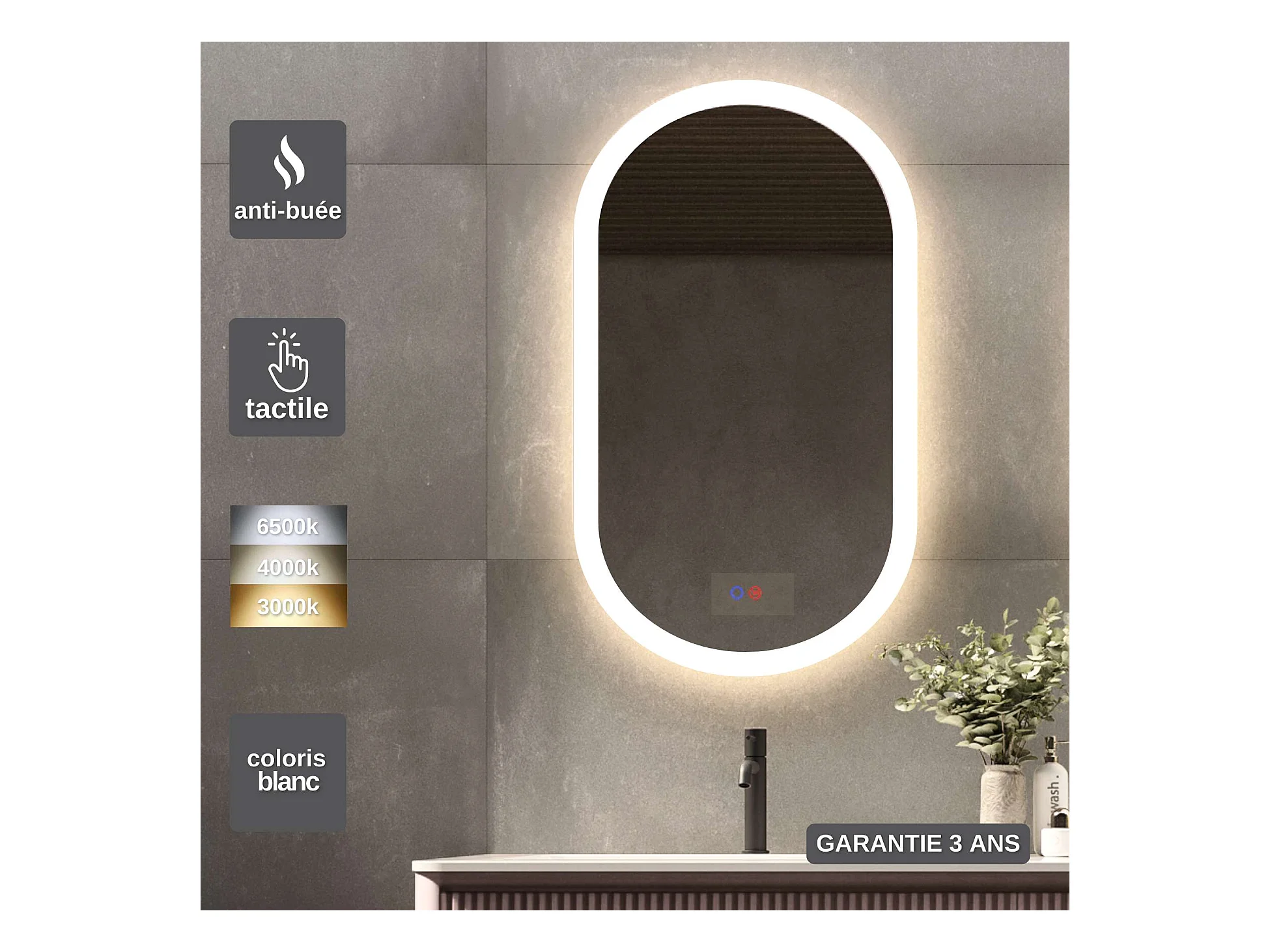 Miroir Salle de Bain MILANO Blanc 50X90cm - Led T° Variable Rétro-éclairé & Frontal - Tactiles On/Off & Anti-Buée - LEDIMEX