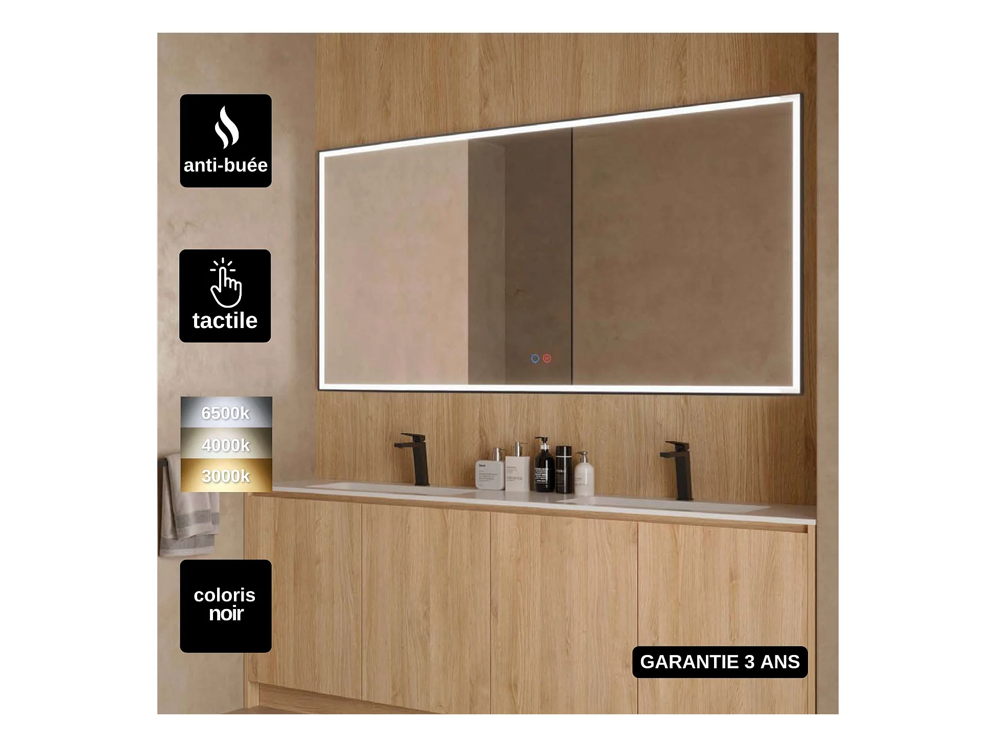 Miroir Salle de Bain SUIZA - 120x80cm - Noir Mat - Led Frontal T° Variable - Tactiles On/Off & Anti-Buée - LEDIMEX