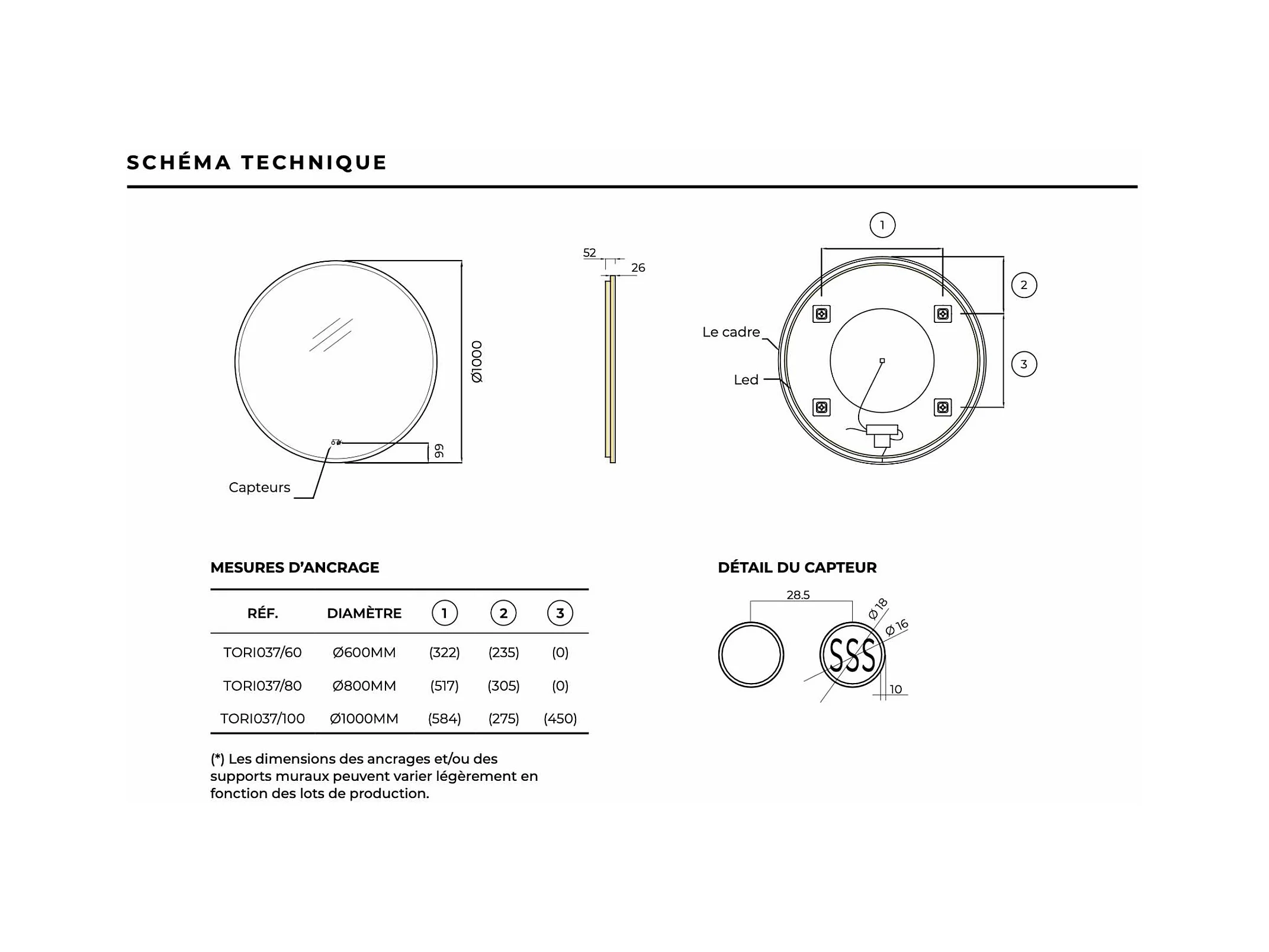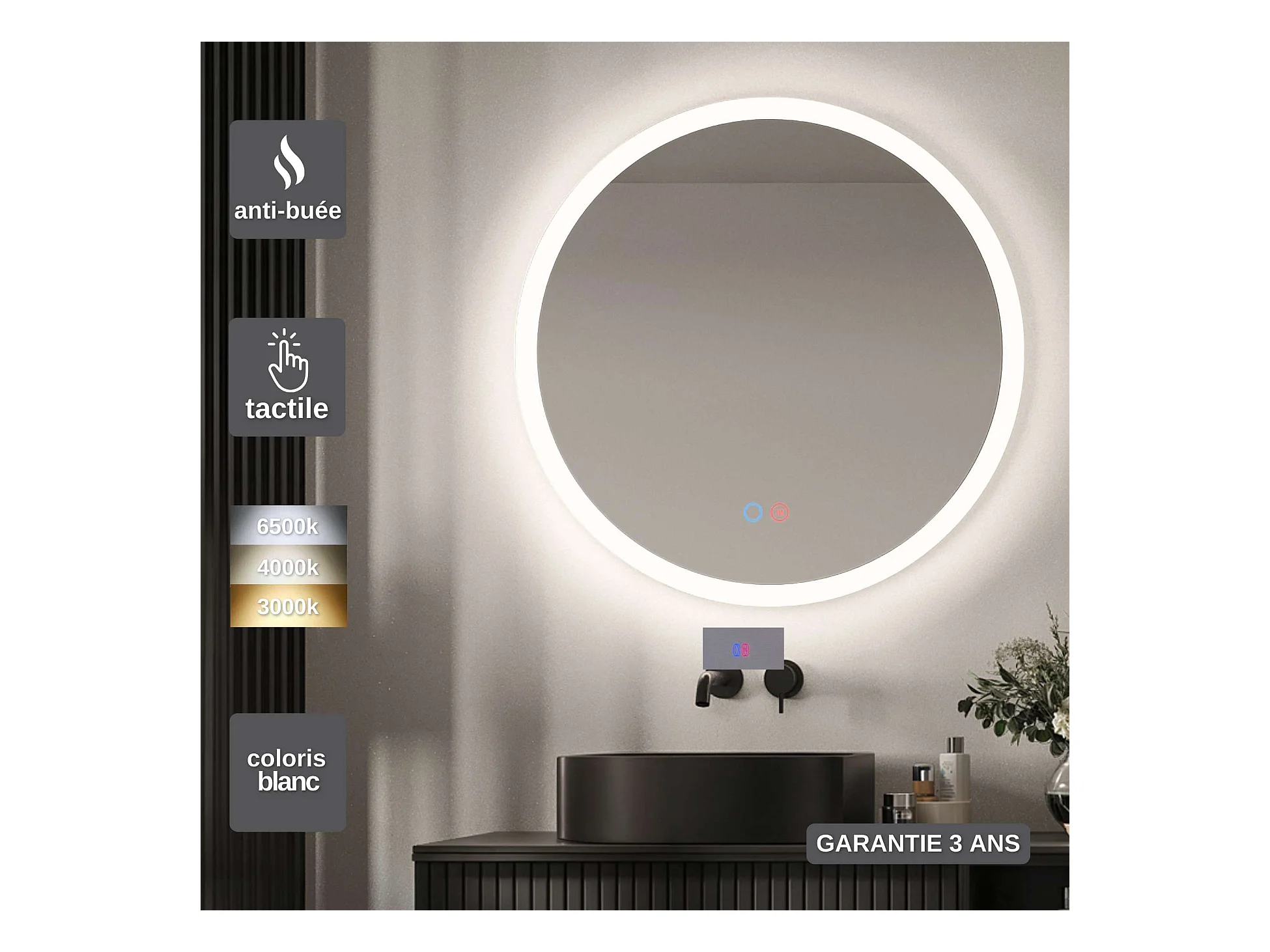 Miroir Salle de Bain TORINO Blanc Ø60cm - T° Led Variable Rétro-éclairé & Frontal - Tactiles On/Off & Anti-Buée - LEDIMEX