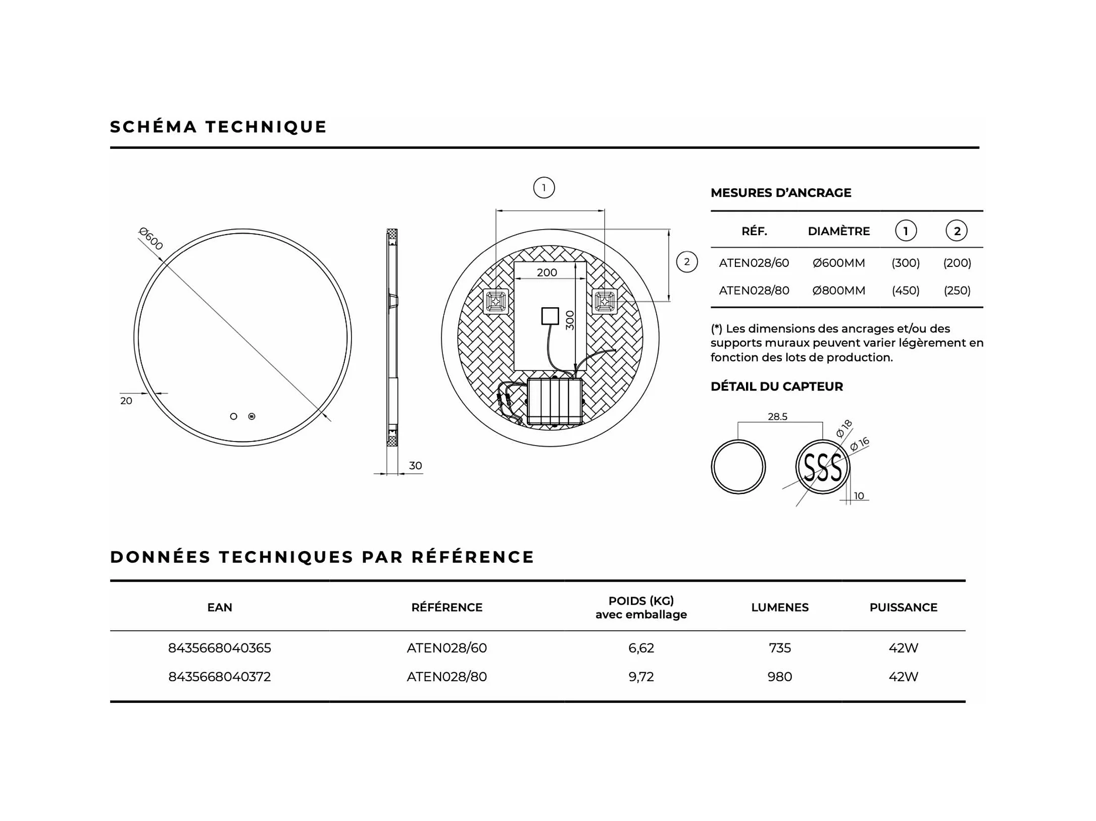 Miroir Salle de Bain ATENAS - Ø60cm - Led T° Variable - Tactiles On/Off & Anti-Buée - LEDIMEX