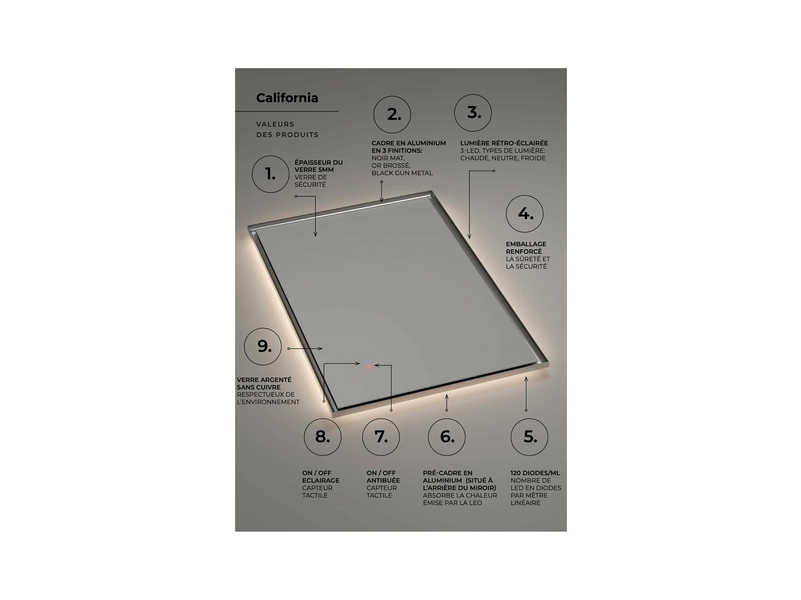 Miroir Salle de Bain CALIFORNIA - 120x80cm - Noir BGM - T° Led Variable - Tactiles On/Off & Anti-Buée - LEDIMEX
