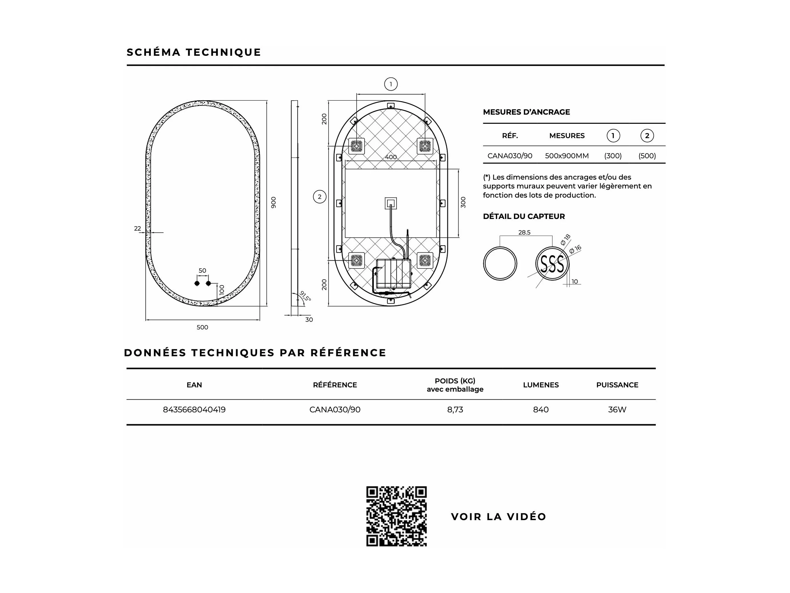 Miroir Salle de Bain CANADA - 50x90cm - Led Frontal (6500K) - Double Tactile & Anti-Buée - LEDIMEX