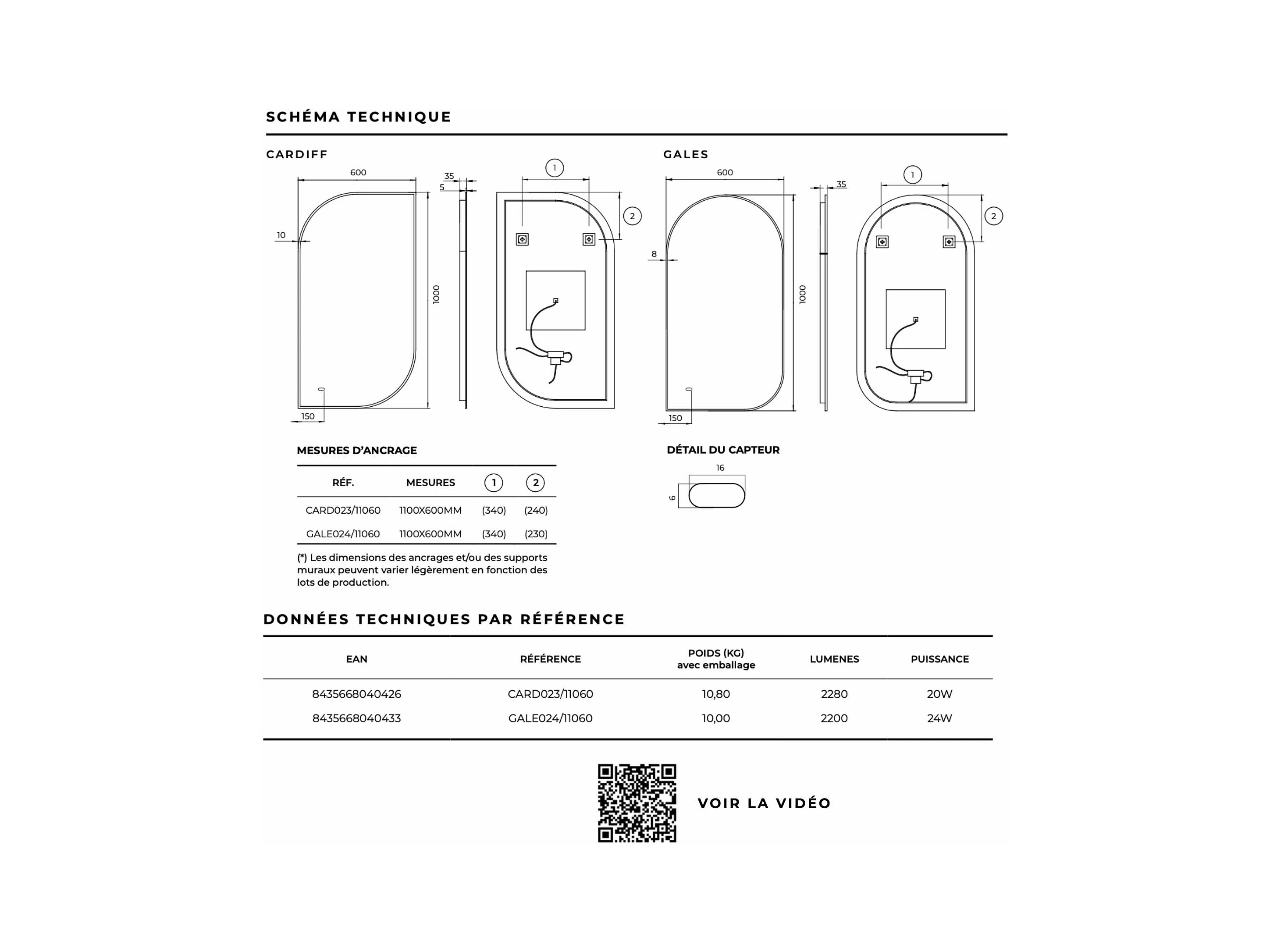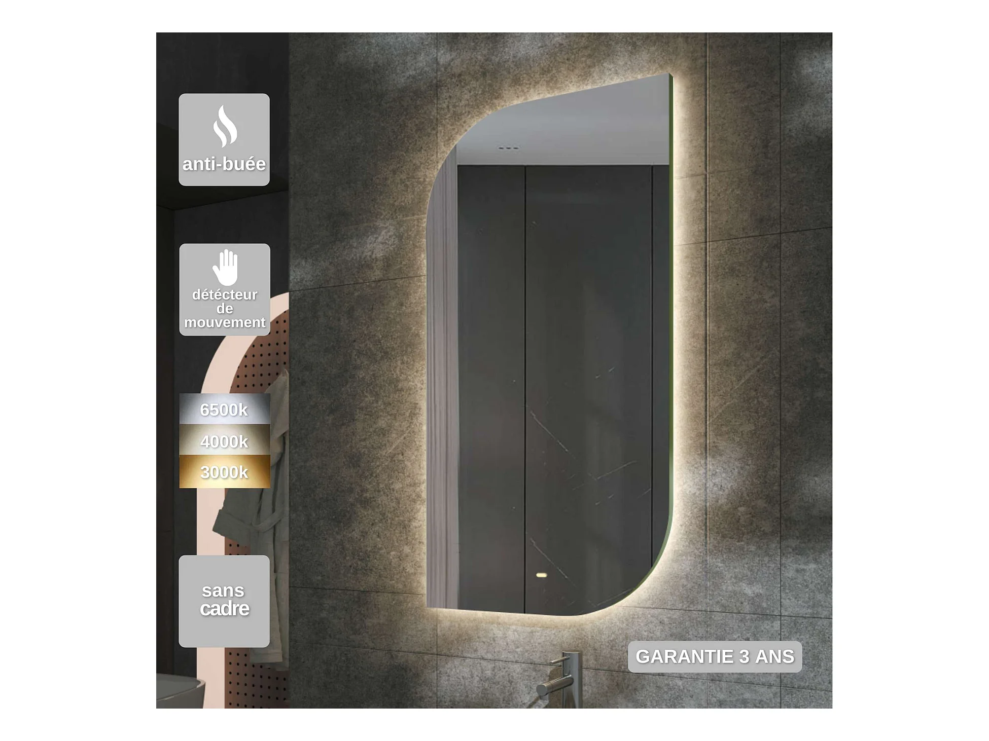 Miroir Salle de Bain CARDIFF - 60x110cm - Led Rétro-éclairé (3000K) - Anti-Buée & Détecteur de Mouvement - LEDIMEX
