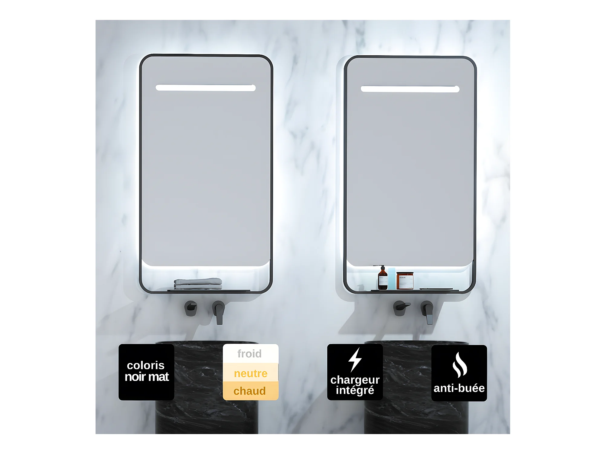 Miroir Salle de Bains Lumineux CONCEPT Anti-Buée et Éclairage Périmétral Triled Chargeur Induction Noir Mat 50x90cm LEDIMEX by SANIZÉO