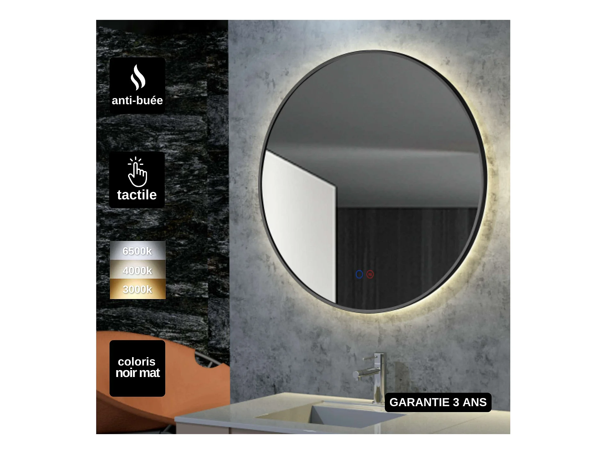 Miroir Salle de Bain FUN - Ø70cm - Noir Mat - Rétro-éclairage T° Led Variable - Tactiles On/Off & Anti-Buée - LEDIMEX