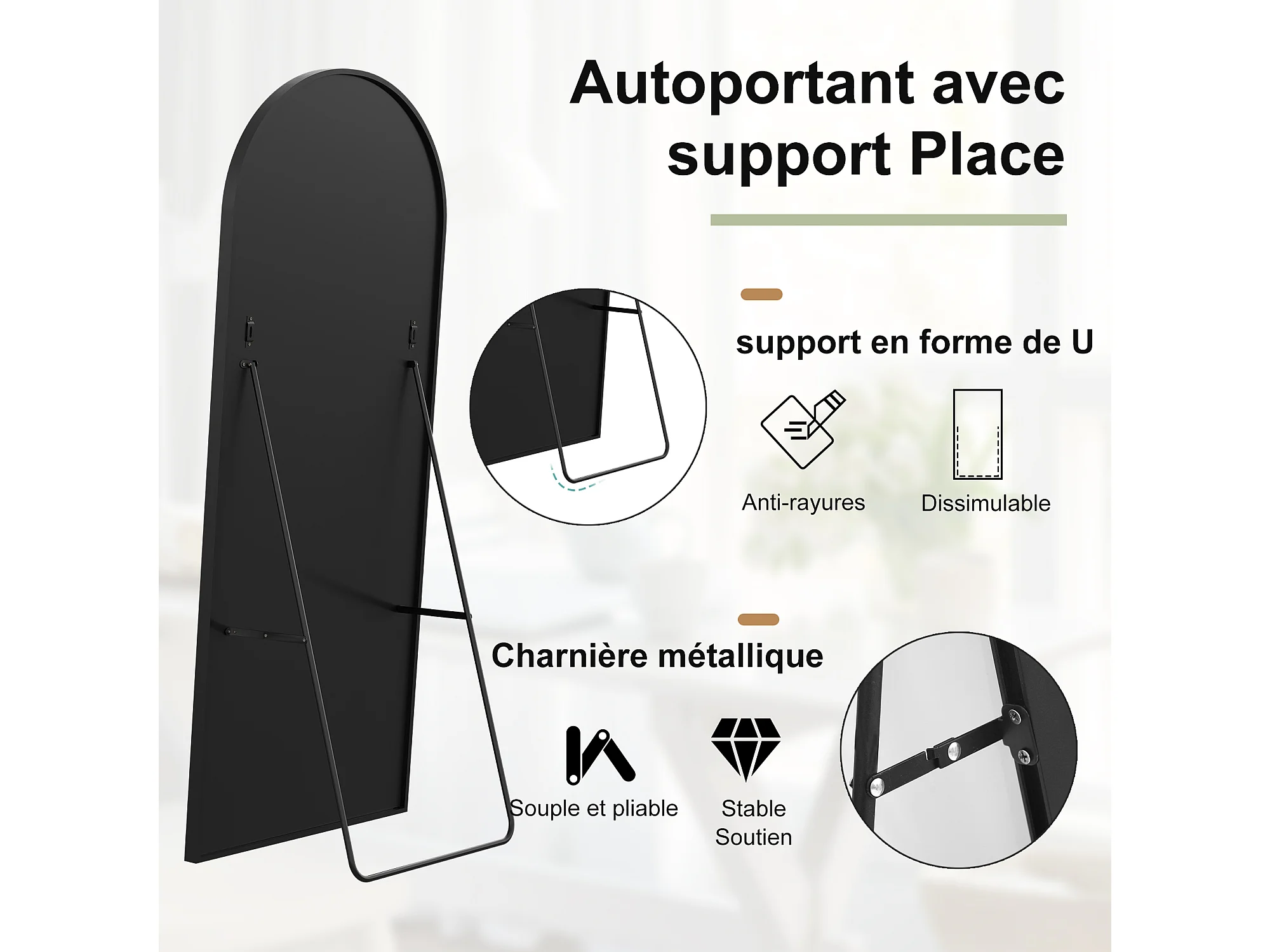 Miroir sur Pied 164 x 54cm, Miroir Arqué sur Pied à Poser au Sol, Cadre en Alliage d’Aluminium, Verre Trempé, Design Arche pour Chambre, Salon et Entrée,Noir