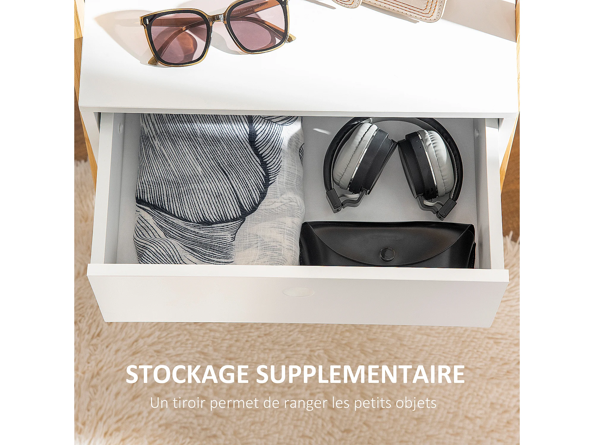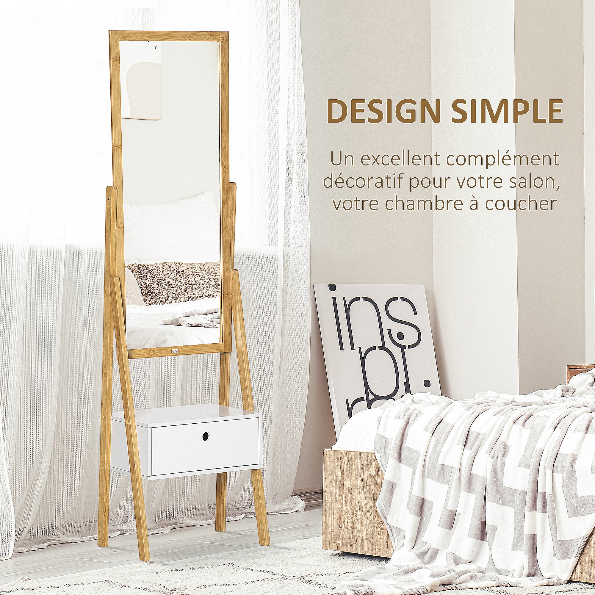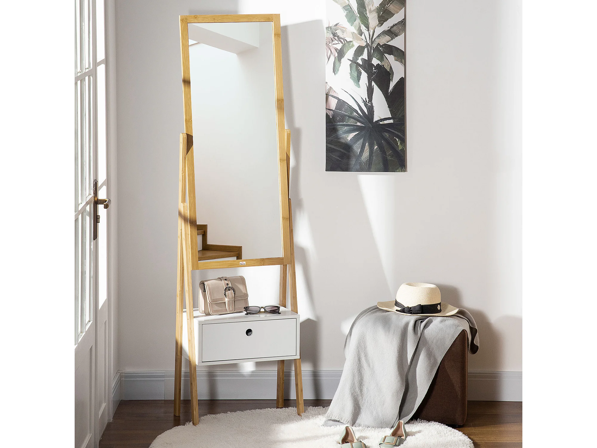 Miroir sur pied avec rangement tiroir en bambou et MDF - dim. 45L x 30l x 160H cm - blanc et naturel