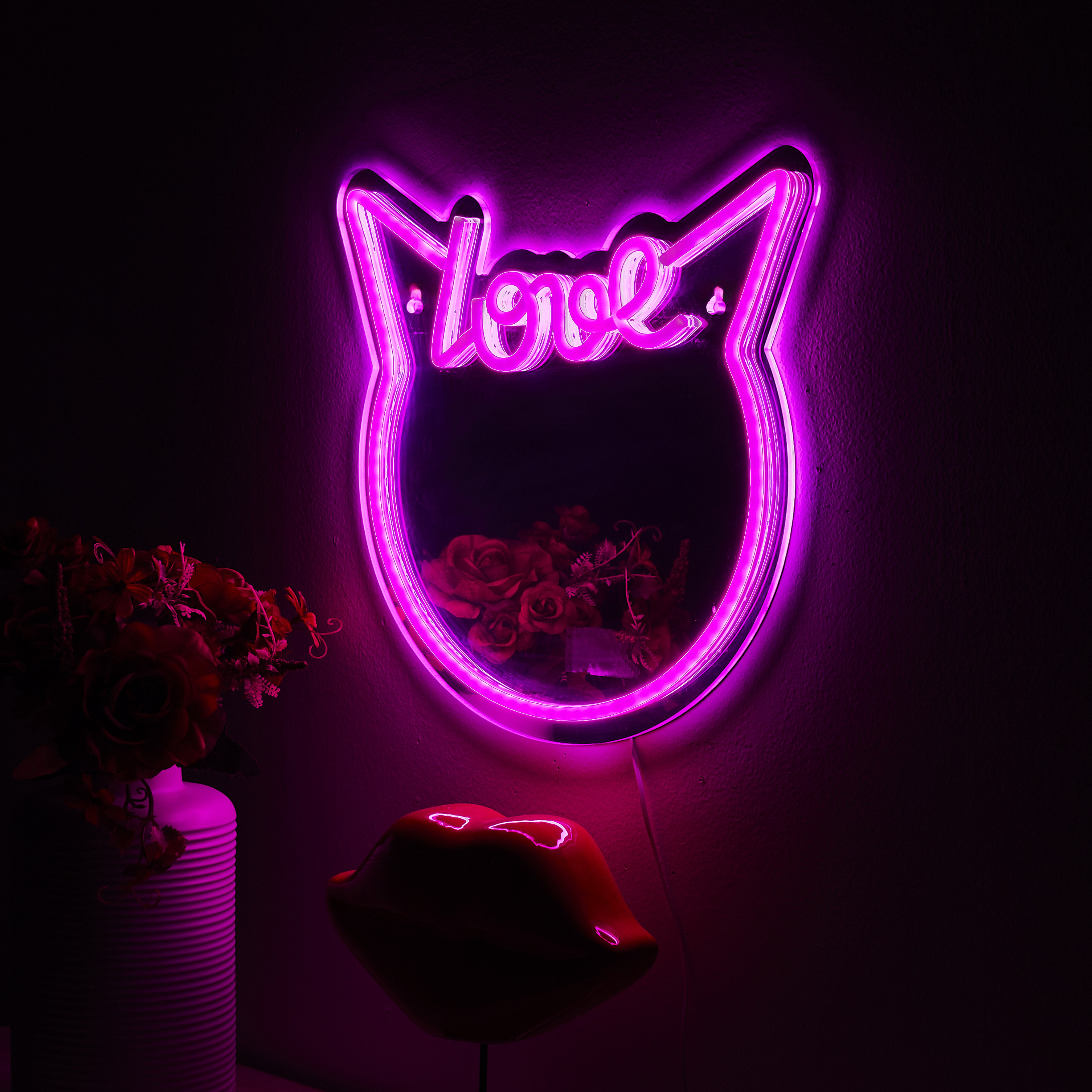 Miroir lumineux chat love kawaii rose style néon avec port USB